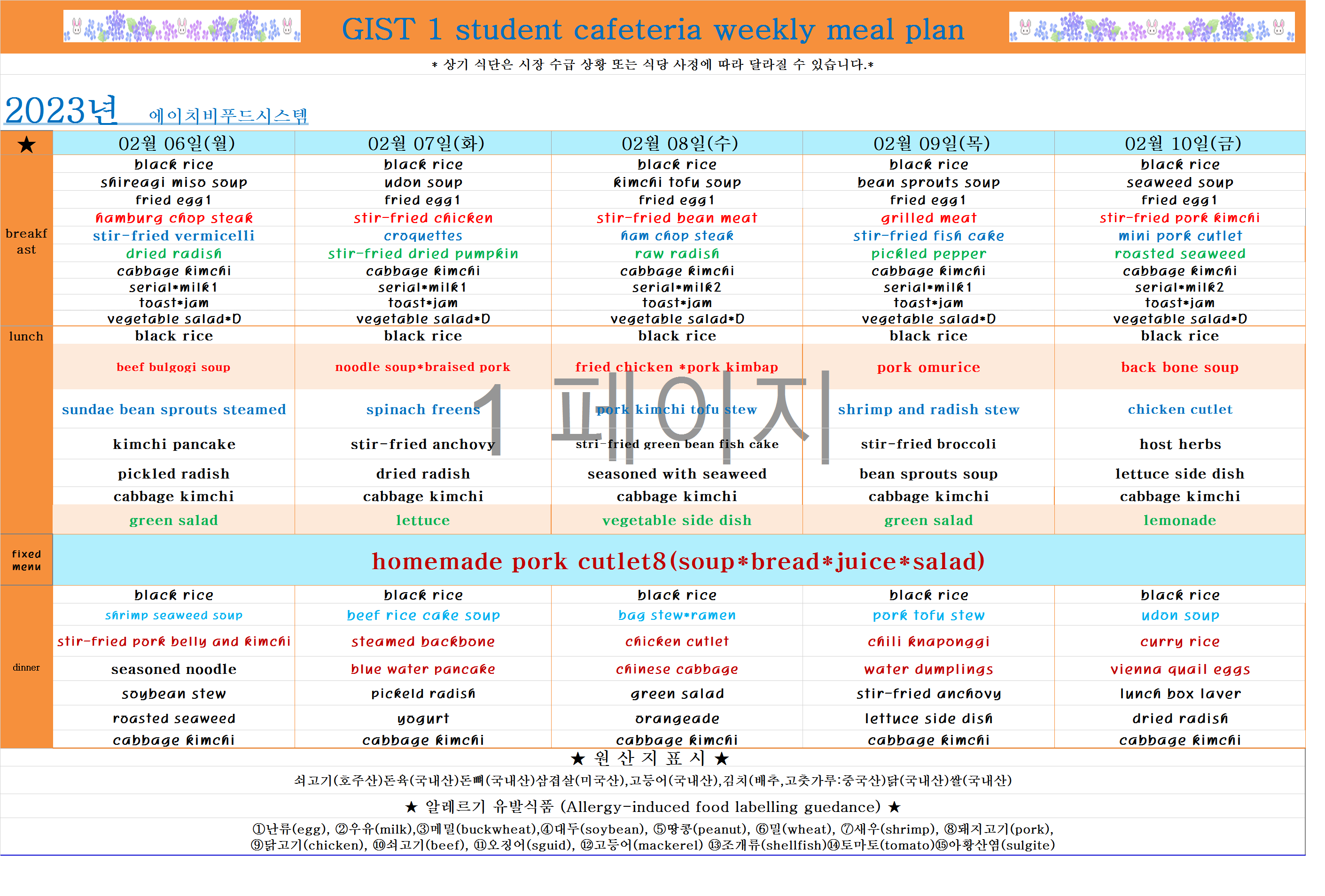 2023년 2월2째주식단표(2월6일~2월10일)