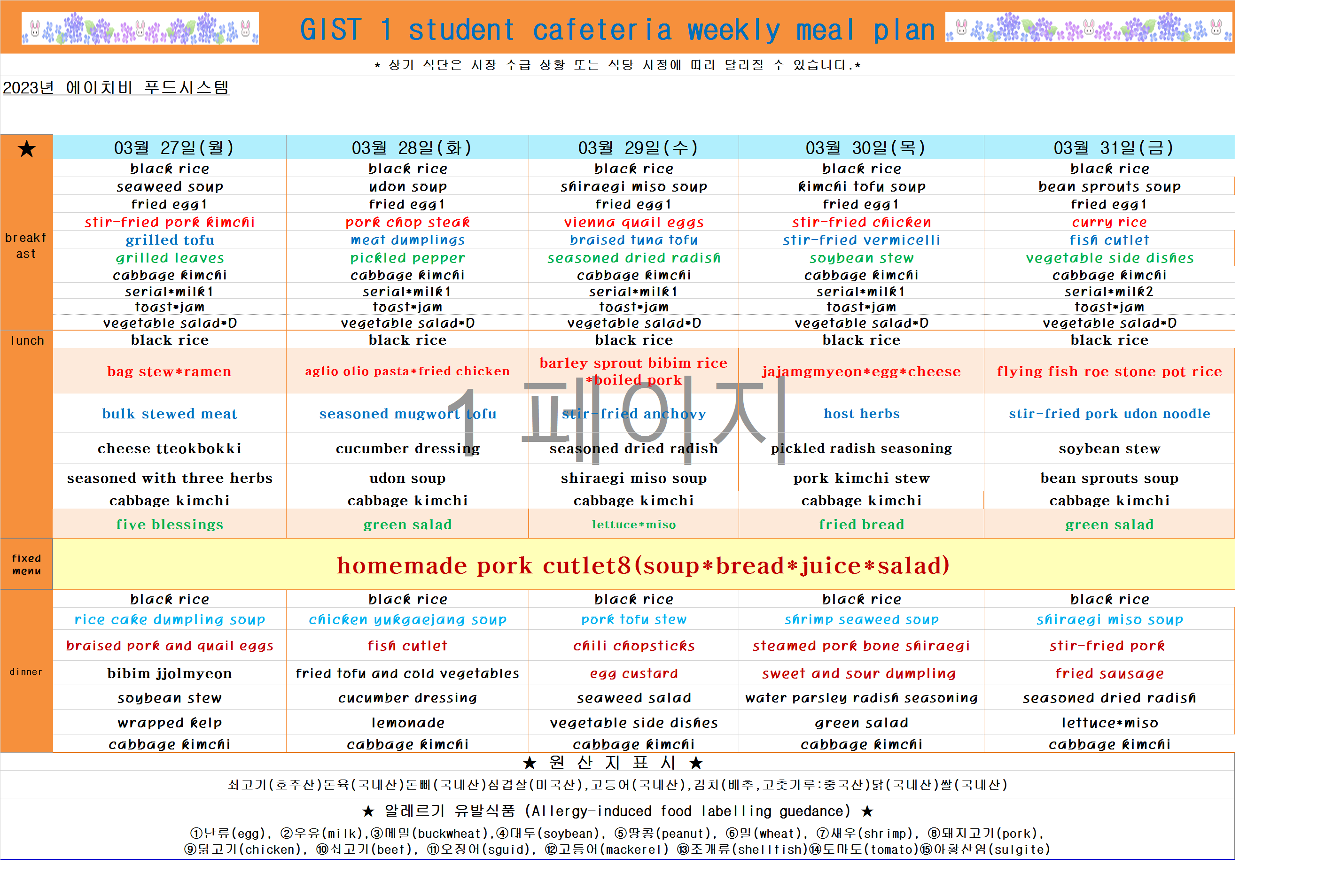 2023년 3월5째주식단표(3월27일~3월31일)