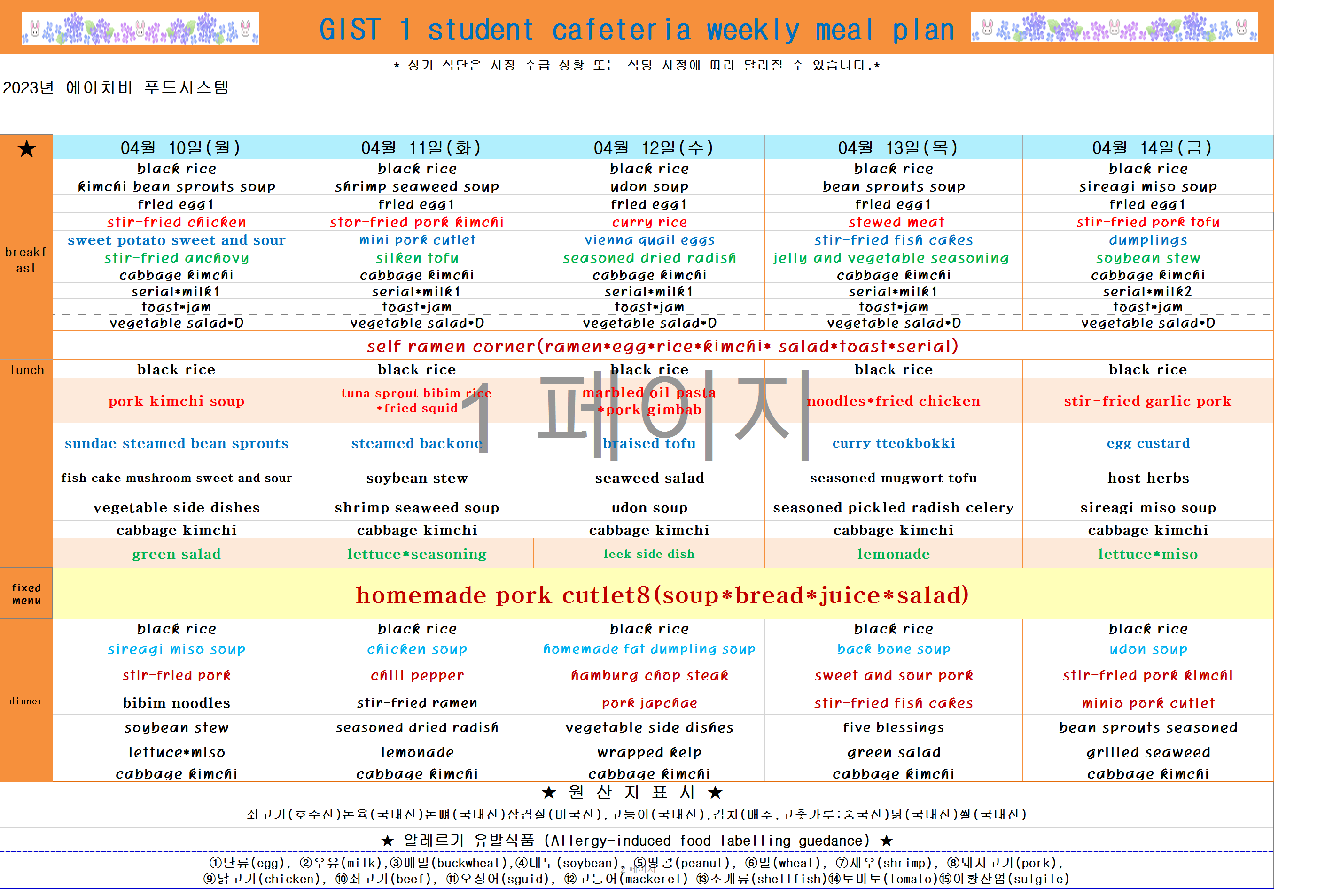 2023년 4월2째주식단표(4월10일~4월14일)