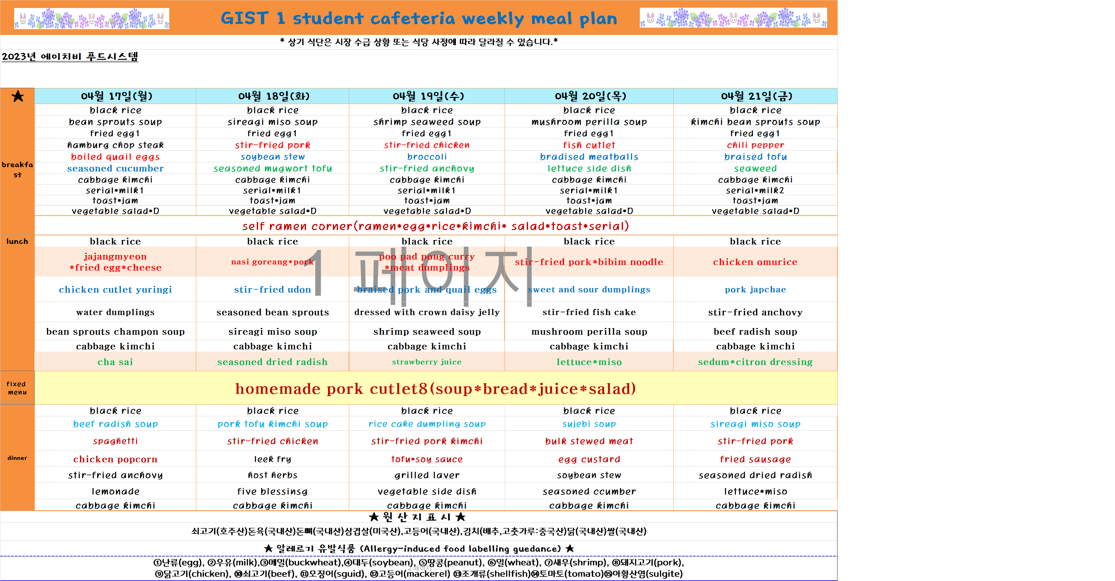 2023년 4월3째주식단표(4월17일~4월21일)