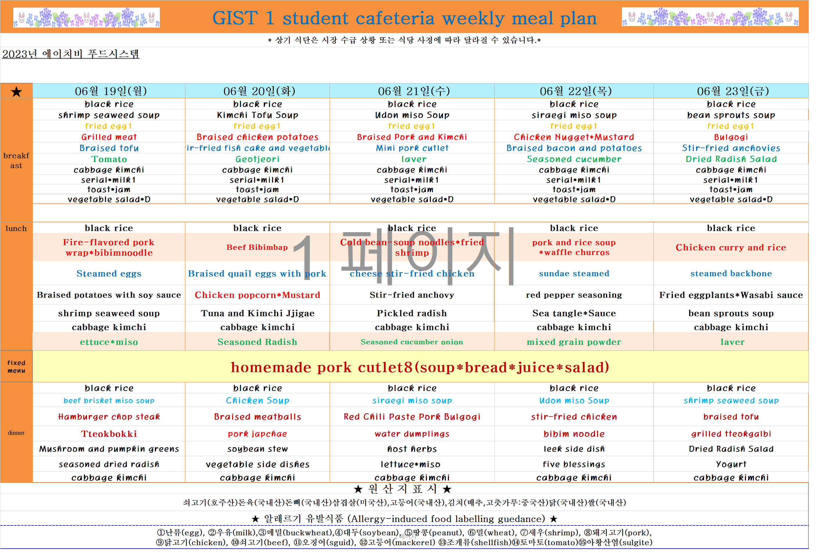 2023년 6월19일~6월23일 식단표