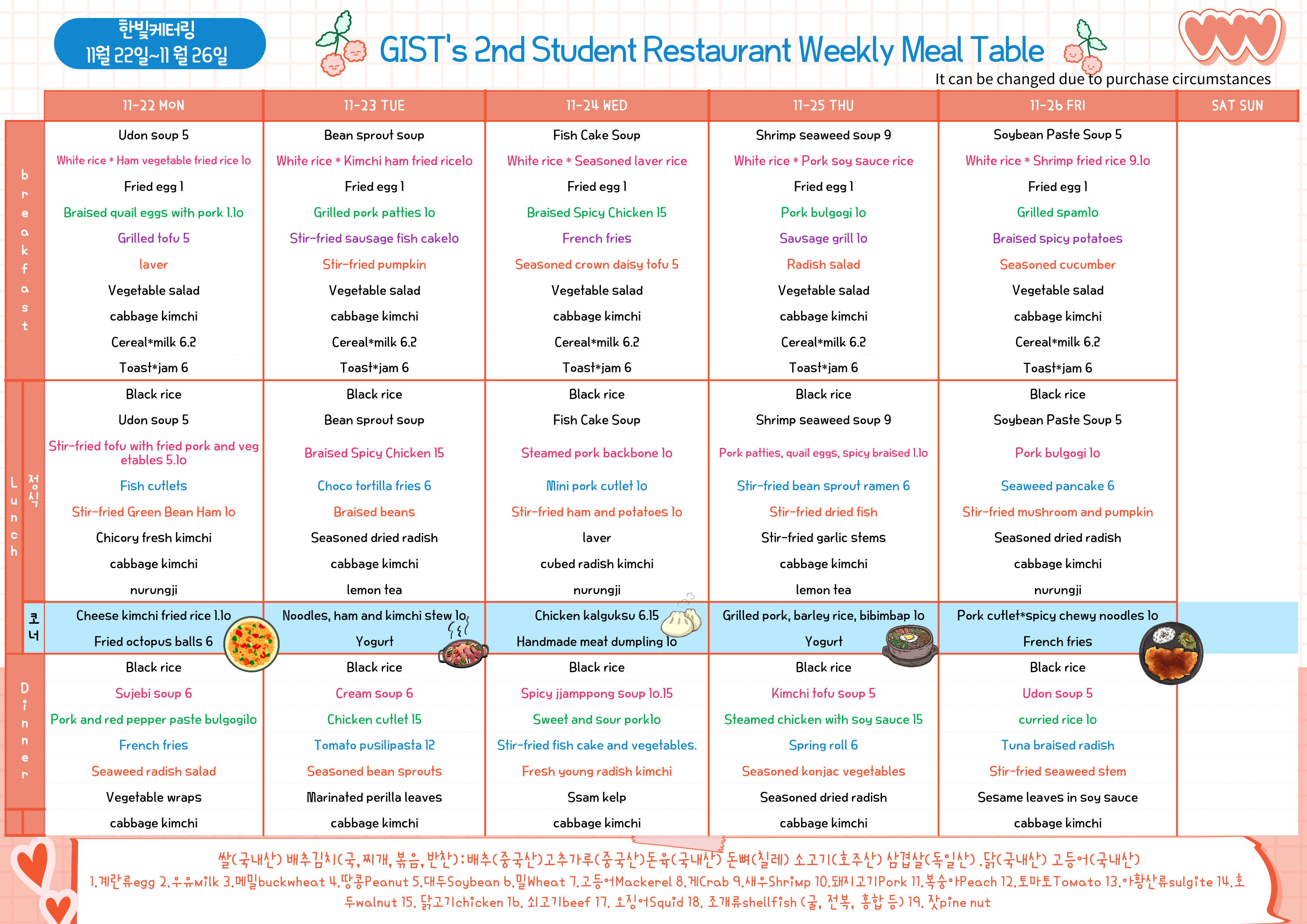 The 2nd Student Restaurant Weekly Meal Table (2021.11.22 ~2021.11.26)