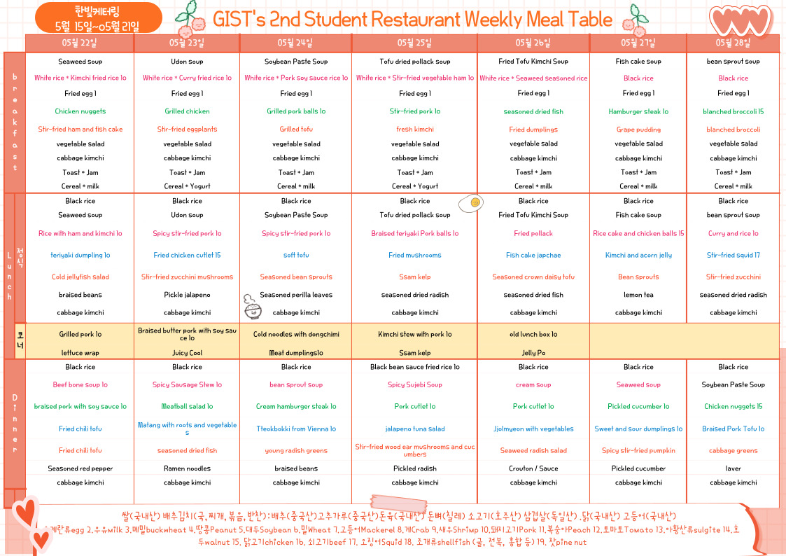 The 2nd Student Restaurant Weekly Meal Table (2023.05.22~23.05.28)
