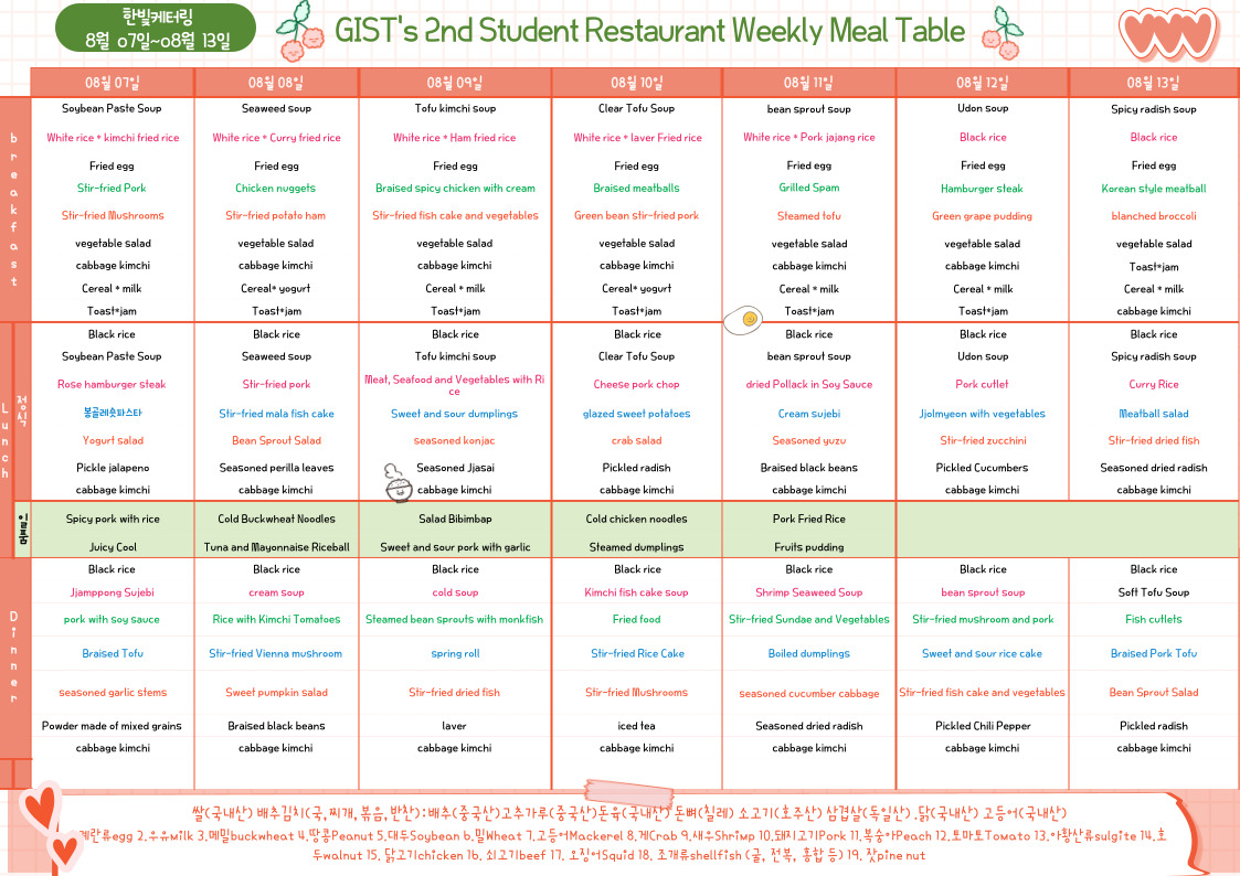 The 2nd Student Restaurant Weekly Meal Table (2023.08.07~23.08.13)