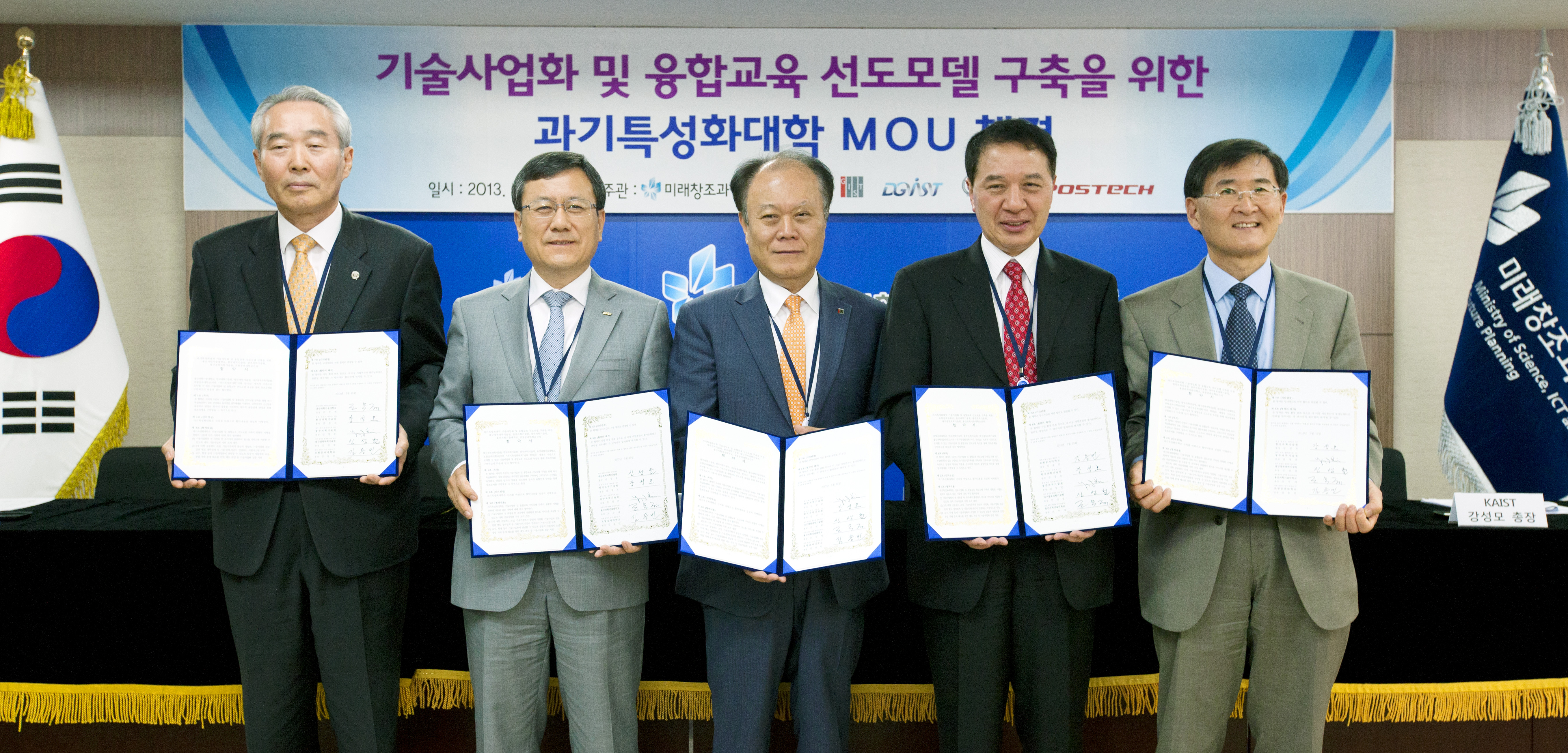 [Press Release] Five Science & Technology Specialized Universities Sign an MOU for Five STAR Initiative On May 15, Five Science & Technology Specialized Universities sign an MOU for Five STAR Initiative to utilize the scientific and technological advantages obtained through R&D for business purposes □ The Presidents of Five Science & Technology Specialized Universities announced Five STAR (Science and Technology After R&D) Initiative and signed an MOU for the Initiative at the main conference room of the Ministry of Science, ICT & Future Planning. Five Science & Technology Specialized Universities are Gwangju Institute of Science and Technology (GIST, President Young Joon Kim), Korea Advanced Institute of Science and Technology (KAIST, President Kang Sung-mo), Daegu Gyeongbuk Institute of Science and Technology (DGIST, President Shin Sung-chul), Ulsan National Institute of Science and Technology (UNIST, President Cho Moo-je), and Pohang University of Science and Technology (POSTECH, President Kim Yong-min). □ The Initiative is developed by Five Science & Technology Specialized Universities and the Ministry of Science, ICT & Future Planning and is expected to nurture new businesses and create decent jobs by utilizing the achievements obtained through the research and development of the Five Universities. □ The Initiative includes: O creating the funds (managed by the Five Universities and invested by the government, private investors, and the Five Universities) designated for the Five Universities to help professors, researchers, and students secure the initial budget for their startups based on their scientific and technological knowledge and to develop curricula specially designed for such startups; O developing the plan to provide the one-stop service to professors, researchers, and students who want to utilize scientific and technological developments for their start-ups from the initial to the last stage of establishing businesses by modifying the functions of the teams at Five Universities designated for collaboration with businesses and industries and by employing specialized workers for such collaboration; and O improving Five Universities’ systems to help professors, researchers, and students start their own businesses by giving professors and researchers more period for the leave of absence or for holding another post outside the campus as a means for them to return to their universities after leaving them for their start-ups and by offering an allowance to professors, researchers, and students who establish their start-ups as a hedge against risk.
