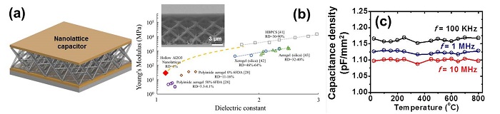 ∘ The fabricated three-dimensional nanolattice capacitors consisted of about 99% of the total volume of air and showed an ultra-low dielectric constant of 1.06-1.10 (measured at 1 MHz). The mechanical properties showed a Young's modulus of 30 MPa, a yield strength of 1.07 MPa, and excellent ductility as the structure was completely restored even after compressive deformation of more than 50%. Thermal stability is almost negligible, with the TCK up to 800oc, 2.43 × 10-5 K-1, in the range of wide frequencies (105 to 106 Hz), voltage (-20v to 20v), temperature (room temperature to 800 degrees Celsius), and the dielectric loss value was at a very low 0.01 to 0.1.
