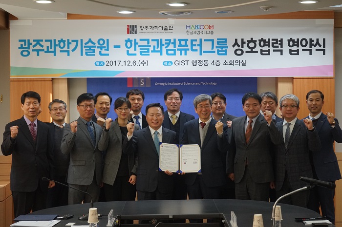 □ The Gwangju Institute of Science and Technology (GIST, President Seung Hyeon Moon) signed a memorandum of understanding (MoU) on December 6, 2017, with Hangul Computer Group (Chairman Sang-cheol Kim), which is an R & D centered company on artificial intelligence for the fourth industrial revolution, to cooperate on science and technology research for a smart city as well as age-friendly industries, healthcare robots, and national defense and security.