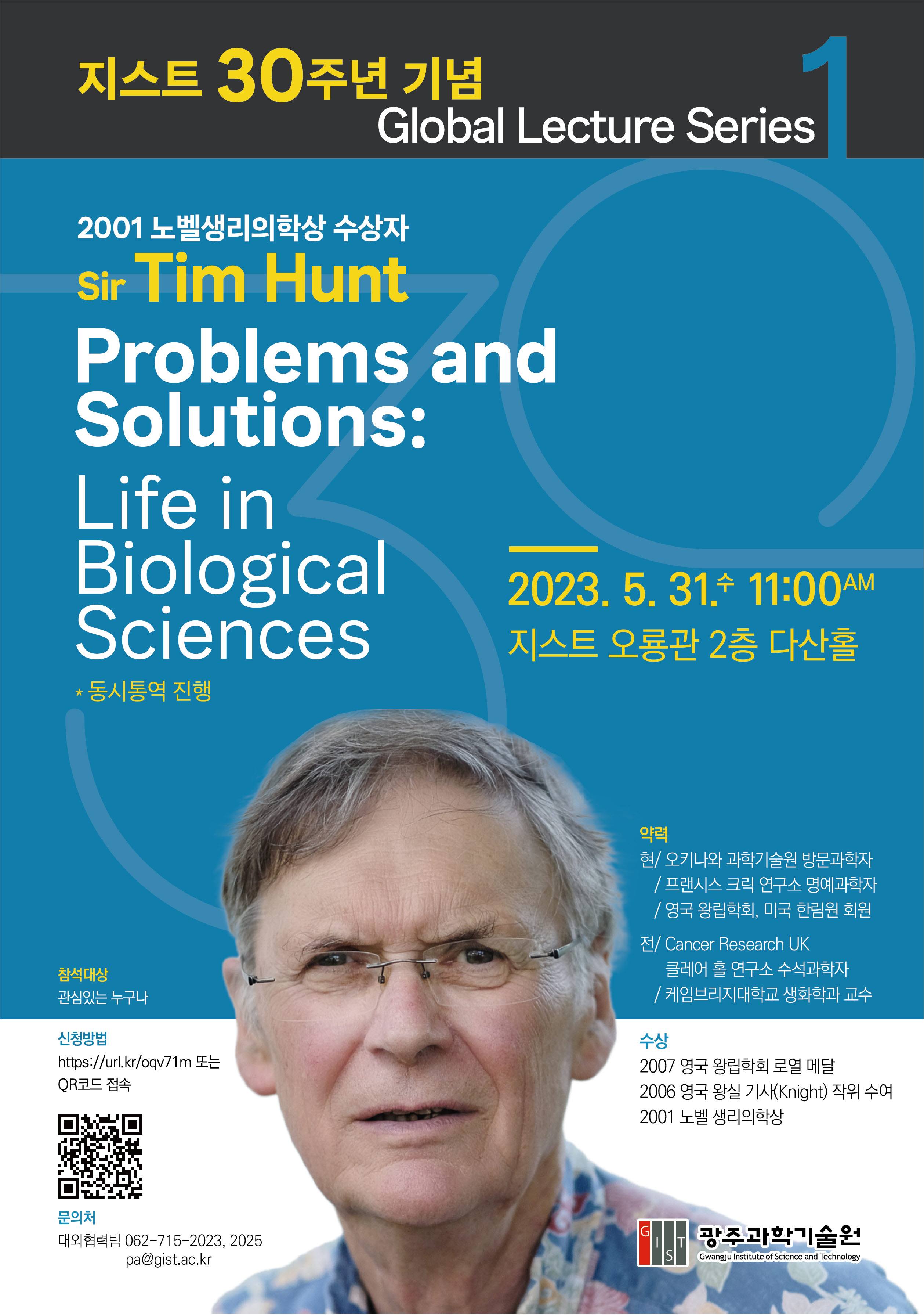 GIST invites Nobel laureate Dr. Tim Hunt to give a lecture in commemoration of its 30th anniversary