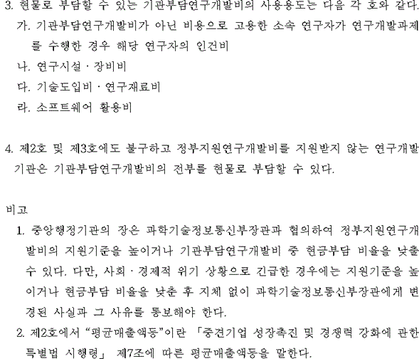 ◇ 주요내용 가. 기관부담연구개발비 미납 시 정부지원연구개발비 지급 중지(제19조제5항 신설) 연구개발기간이 종료되기 3개월 전까지 기관부담연구개발비의 현금부담 금액을 납부하지 아니하는 연구개발기관에 대하여 중앙행정기관의 장이 정부지원연구개발비의 지급을 중지할 수 있도록 함.