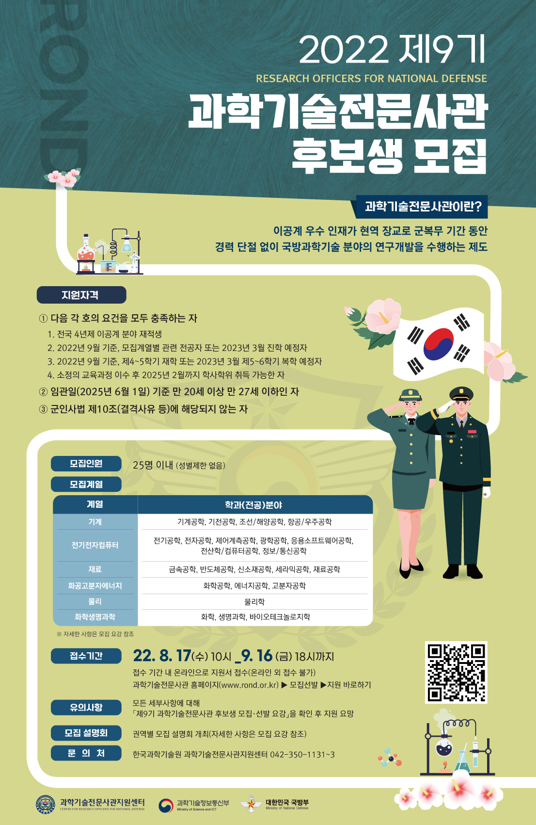 제9기 과학기술전문사관 후보생 모집 선발 공고를 다음과 같이 알립니다.