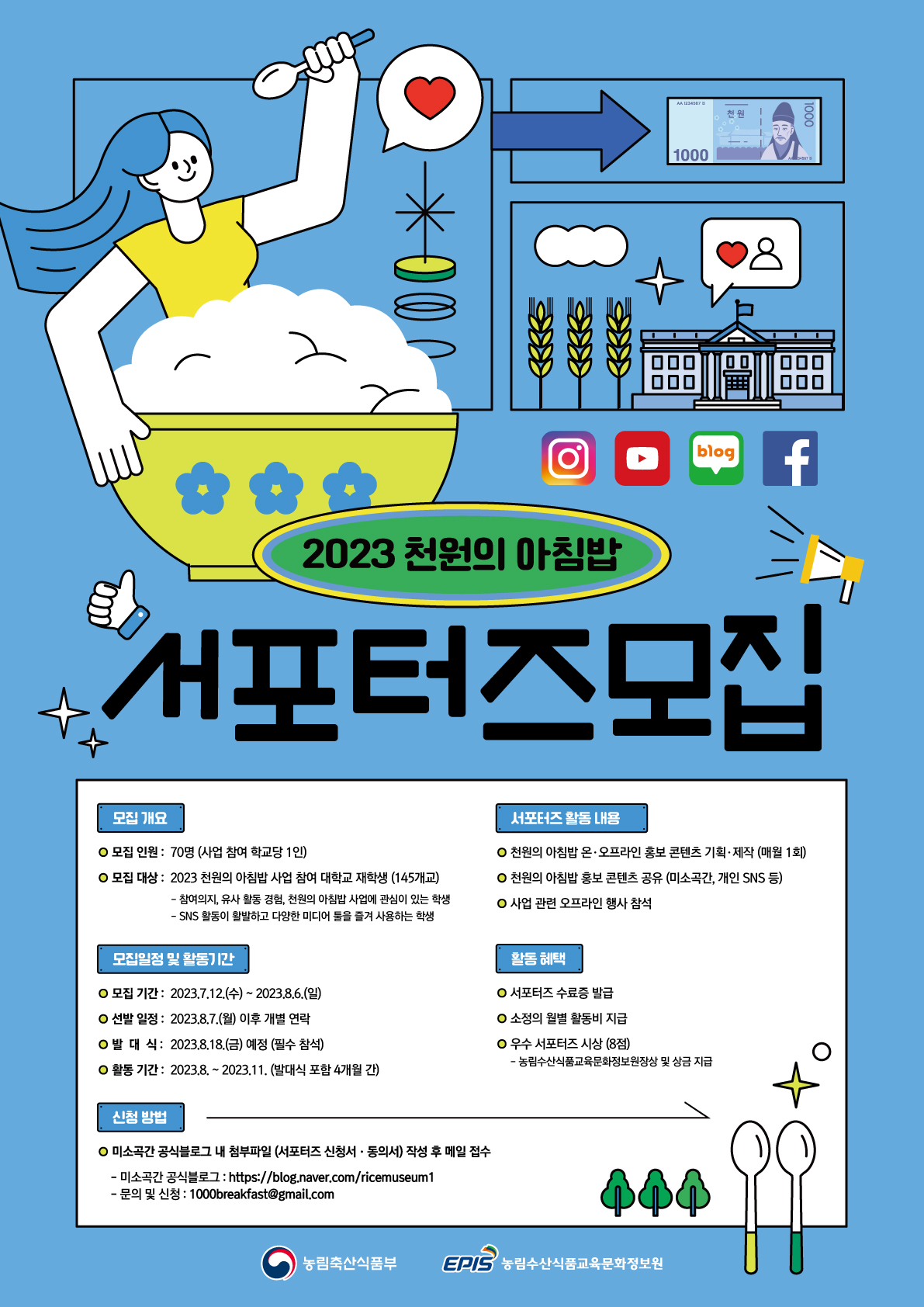 [농림축산식품부] 2023 천원의 아침밥 서포터즈 모집(~2023.8.6.(일))