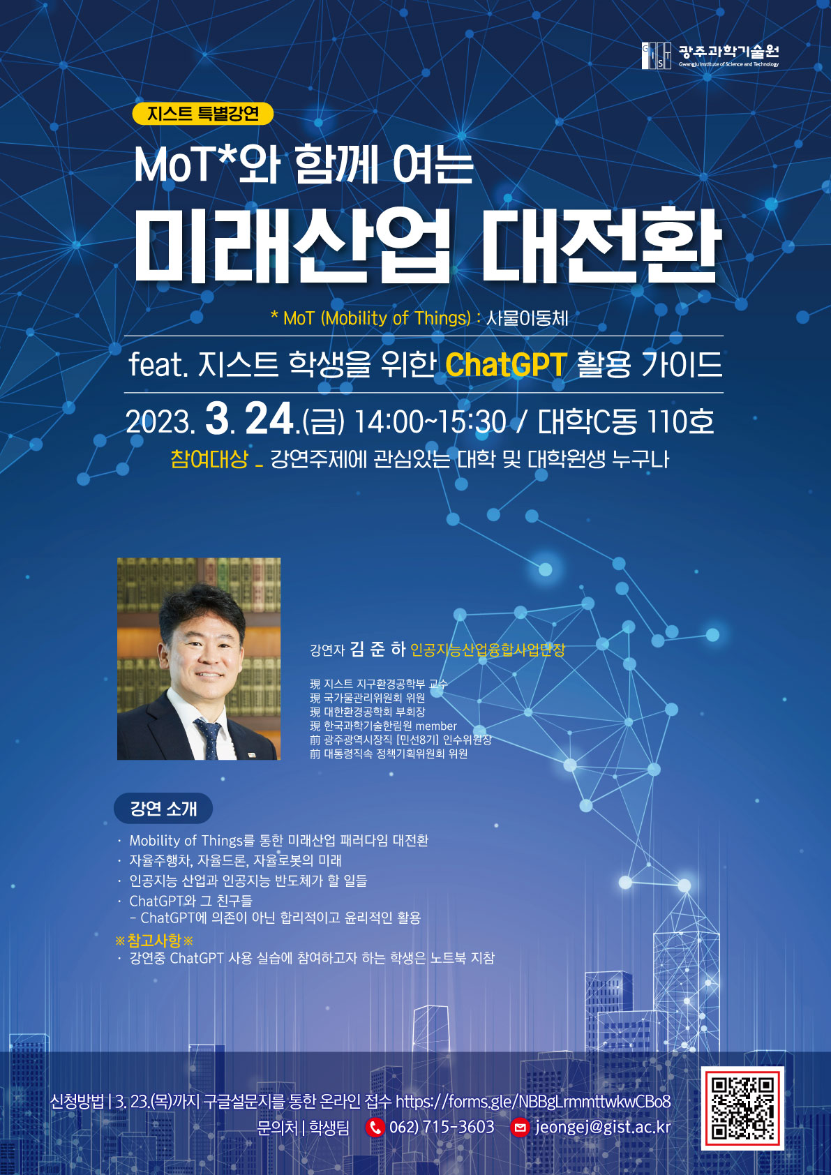 지스트 특별강연 “MoT와 함께 여는 미래산업 대전환(feat.지스트 학생을 위한 ChatGPT 활용가이드)”에 학생 여러분들을 초대합니다.