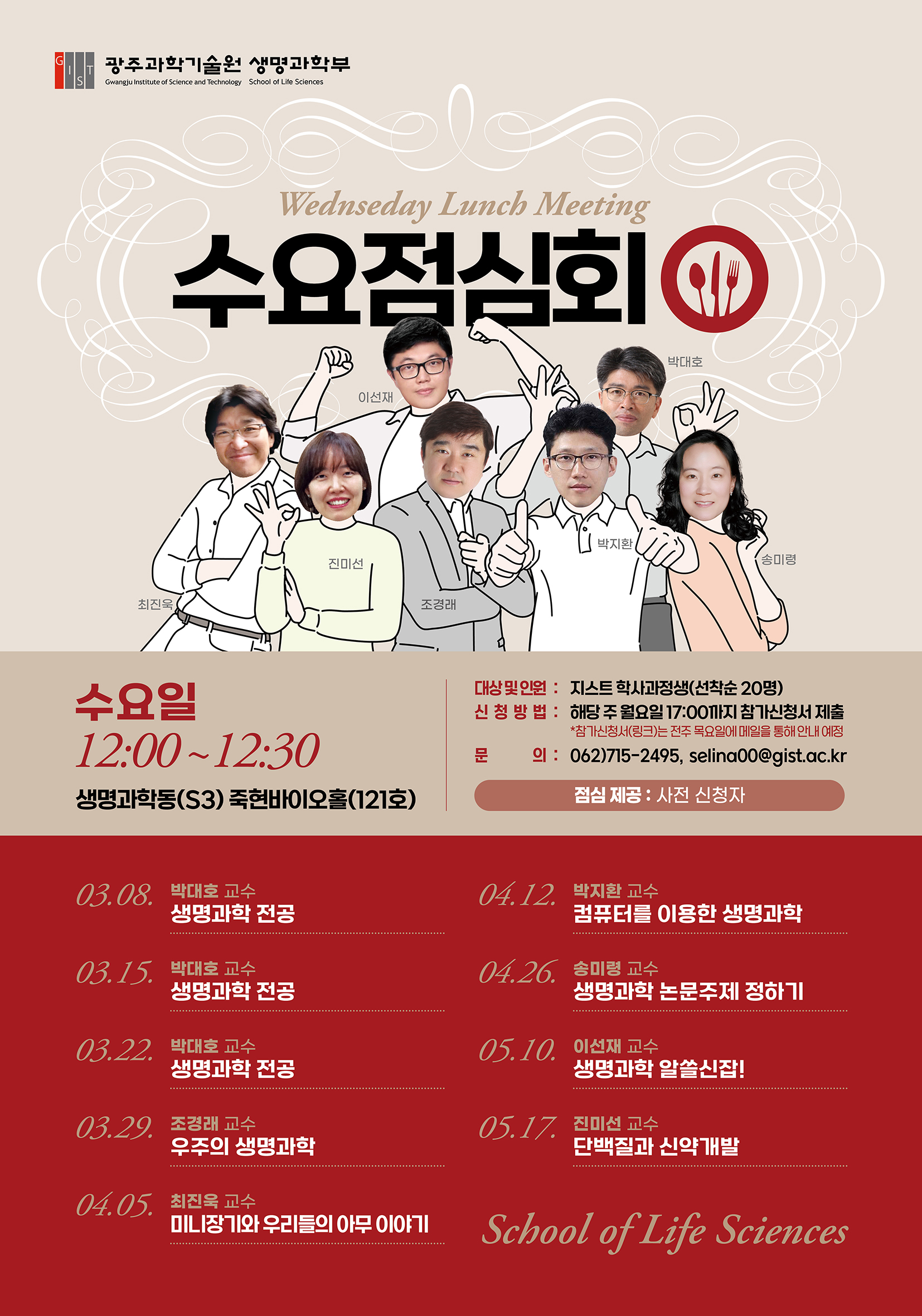 생명과학부에서는 지스트 학사과정생을 대상으로 < 2023년도 1학기 생명과학부 수요 점심회>를 다음과 같이 개최하오니 많은 참여 바랍니다!