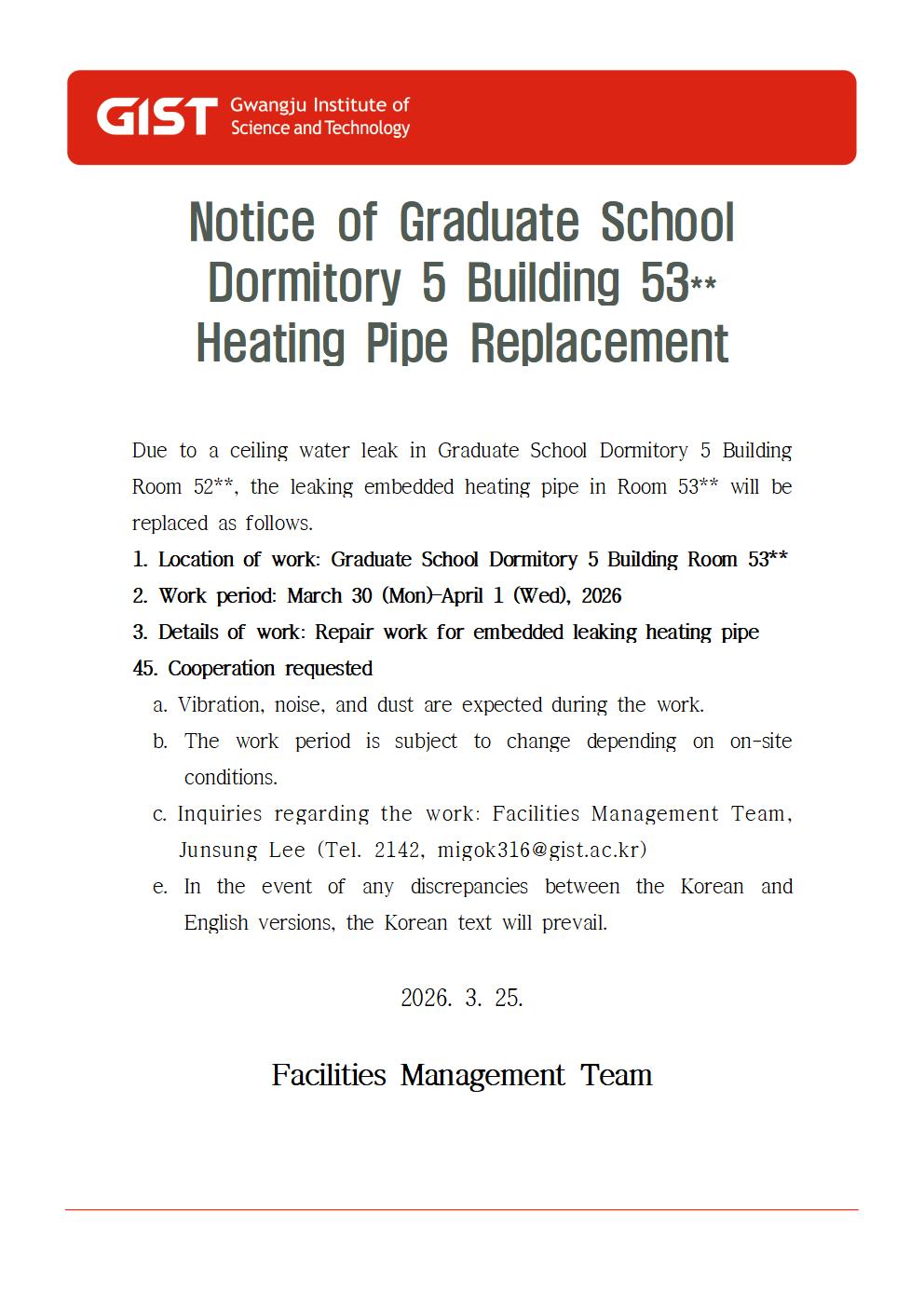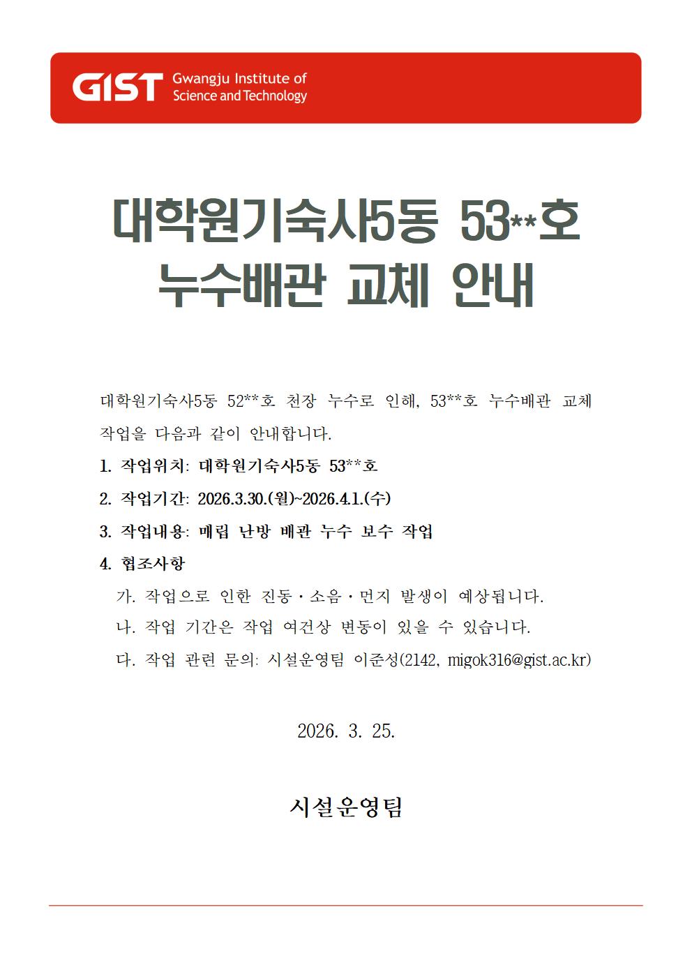 [안내]대학원기숙사5동 53**호 누수배관 교체 안내(2026.3.30.(월)~2026.4.1.(수))