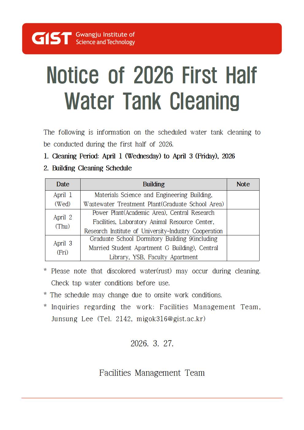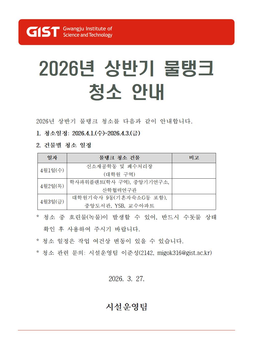 [안내]2026년 상반기 물탱크 청소 안내(2026.4.1.(수)~2026.4.3.(금))