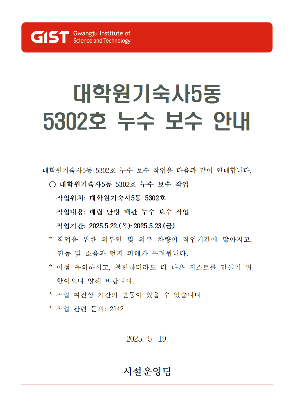 [안내]대학원기숙사5동 5302호 누수 보수 안내(2025.5.22.(목)~2025.5.23.(금))