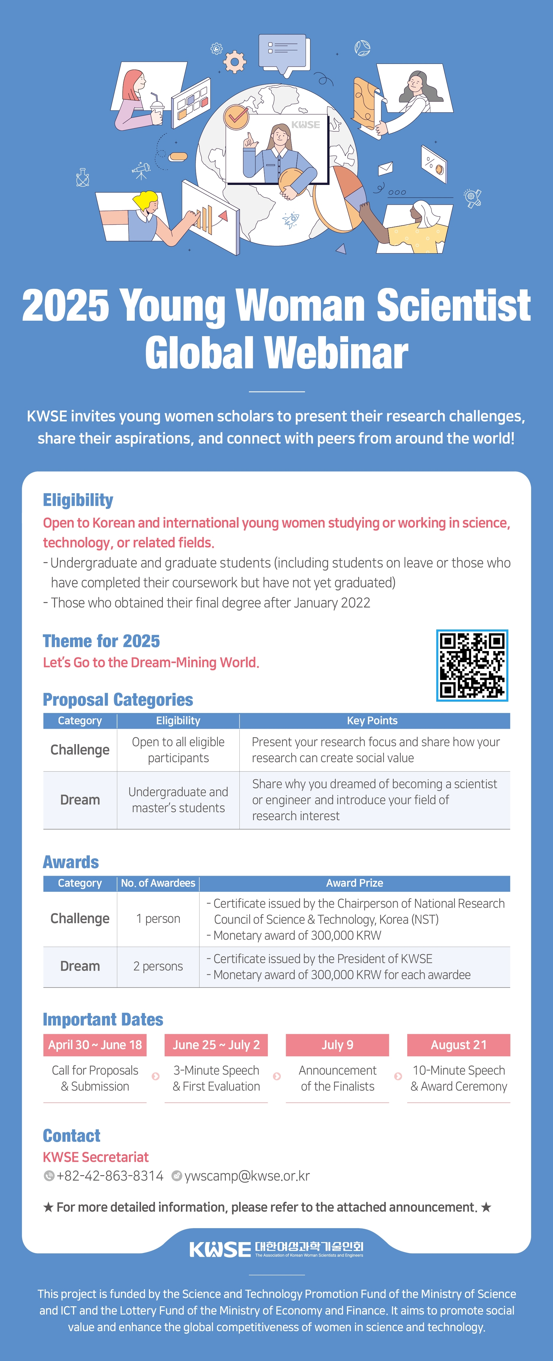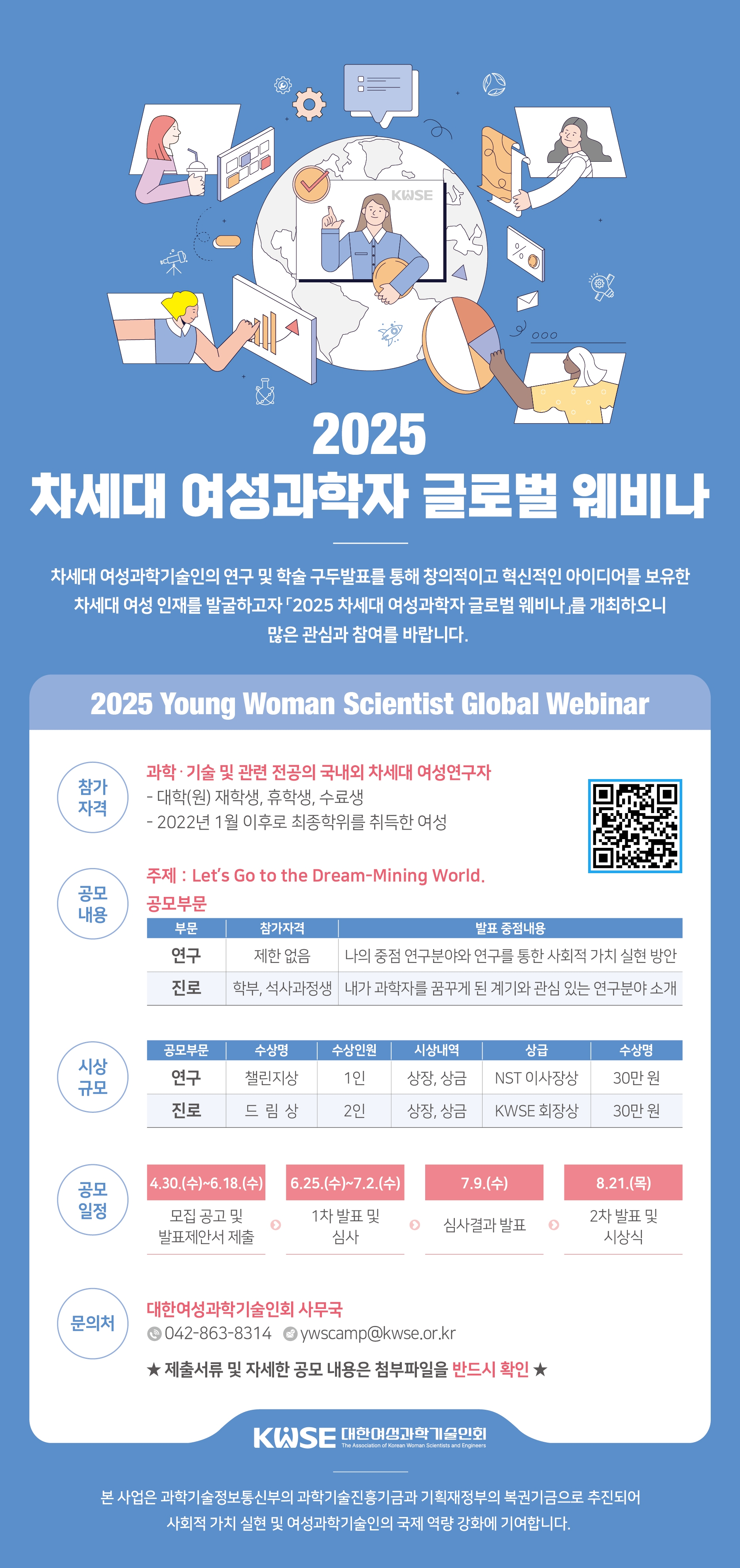 본회에서는 창의적이고 혁신적인 아이디어를 보유한 차세대 여성 인재를 발굴하기 위하여「2025 차세대 여성과학자 글로벌 웨비나」공모전을 개최합니다. 관심있는 학생들의 적극적인 참여 바랍니다.