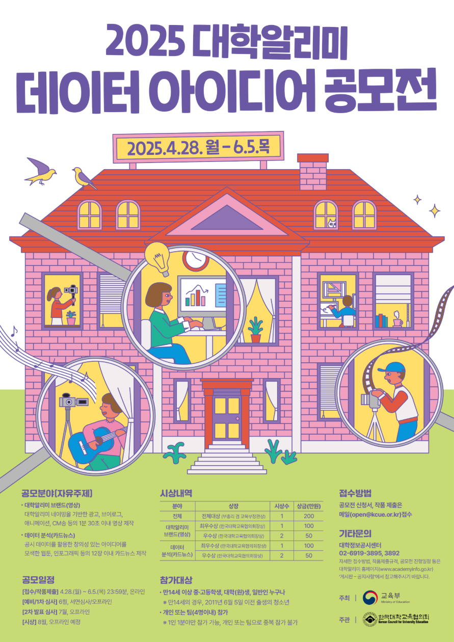한국대학교육협의회 대학정보공시센터에서는 학생 및 학부모, 교사 등 대학알리미 일반 수요자의 공시자료 활용활성화를 위해 2025 대학알리미 데이터 아이디어 공모전을 개최하고 있습니다.