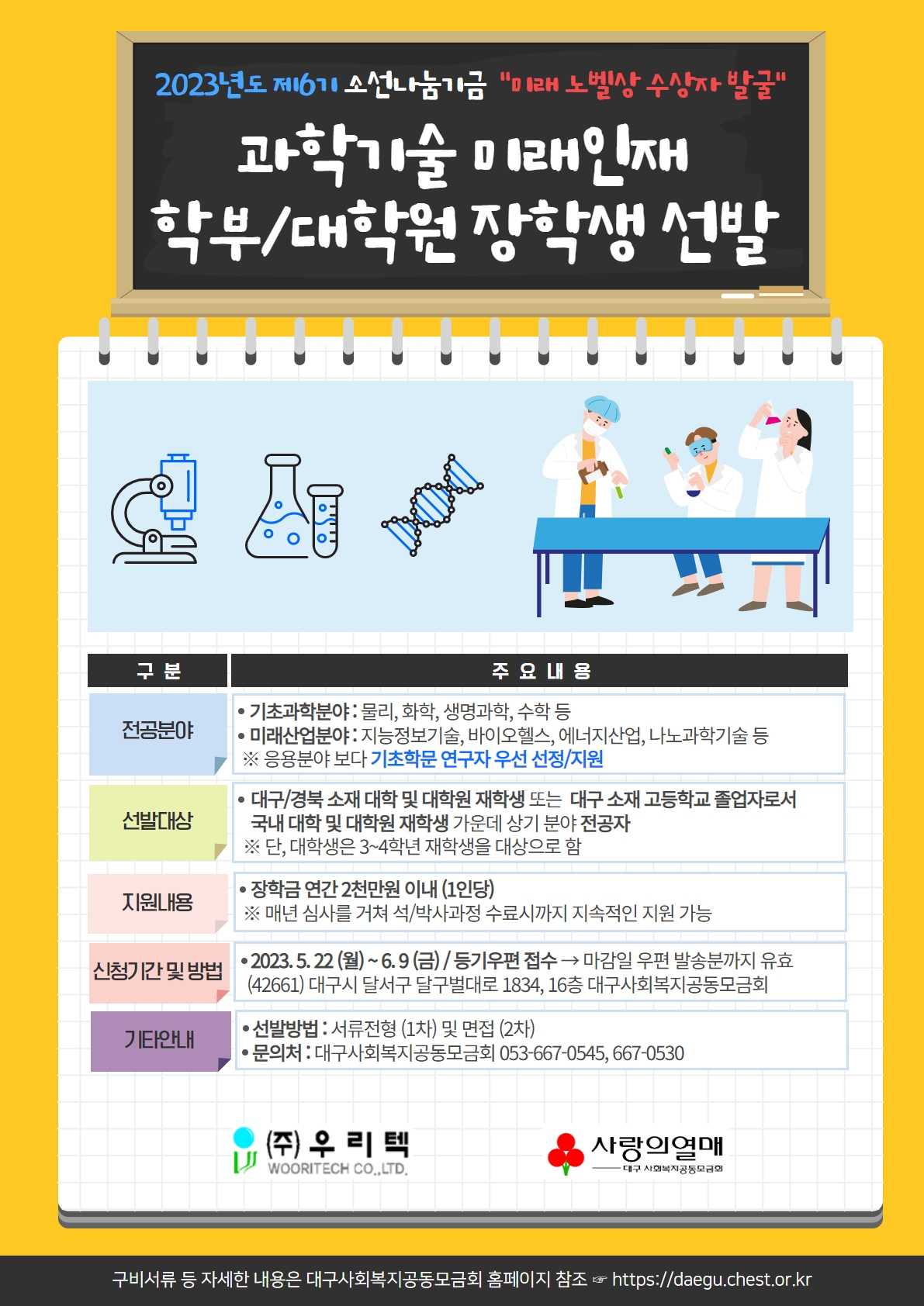 2023년 소선나눔기금 과학기술분야 대학(원)생 장학금 지원사업을 아래와 같이 안내합니다.