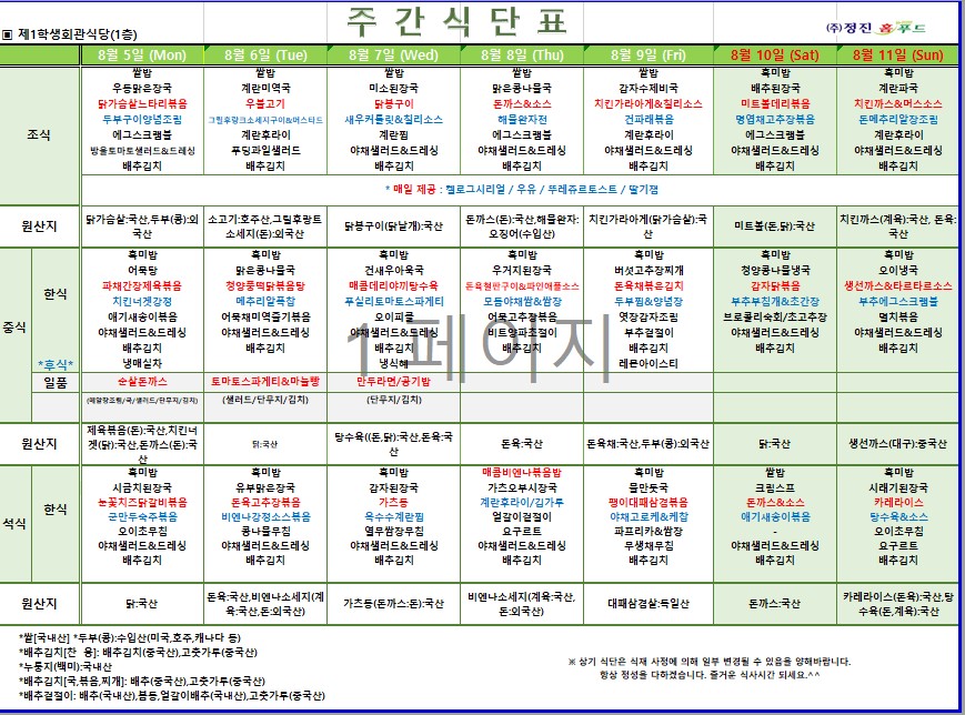 제1학생식당 주간식단표(8/5-8/11)