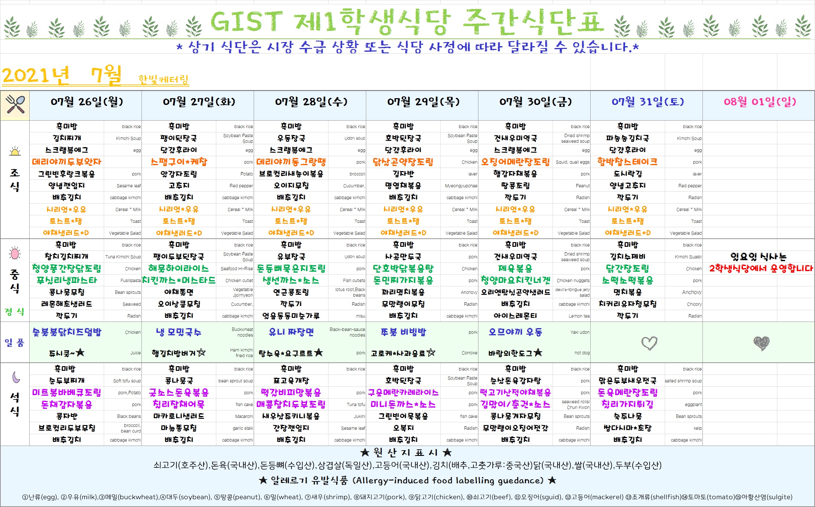 1학생식당 식단표 (7월 26일 -7월 31일)