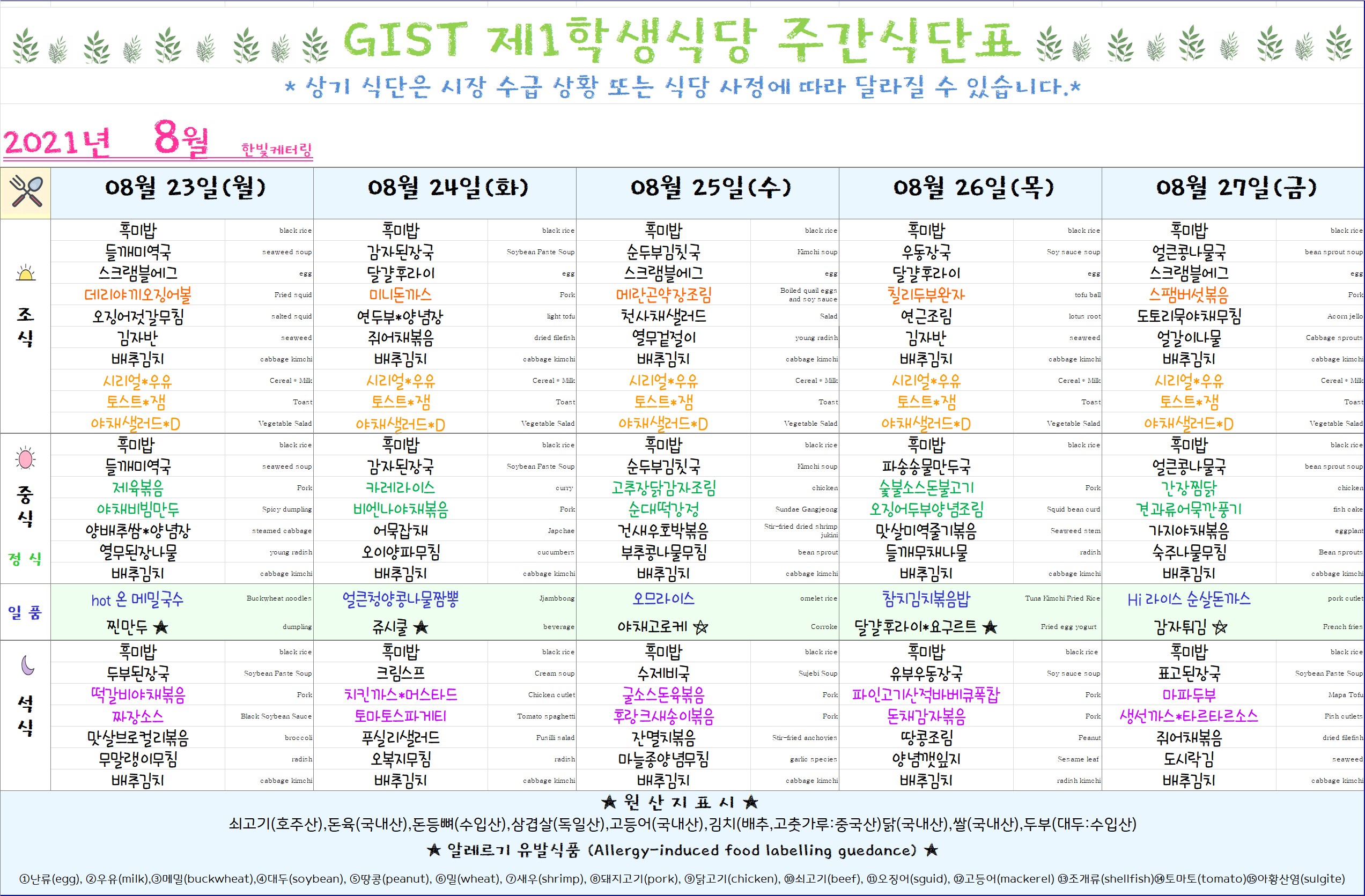 1학생식당 식단표 (08월 23일 -08월 27일)