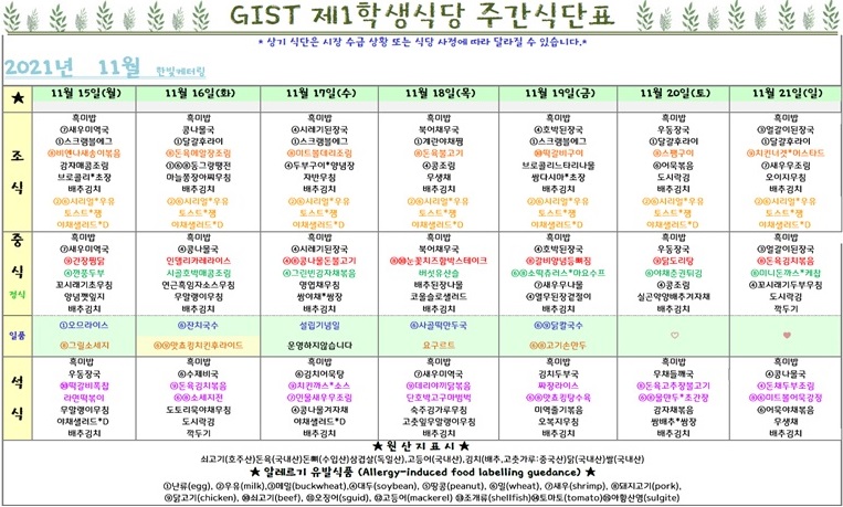 제1학생식당 11월 3째주 식단표(11/15~11/21)