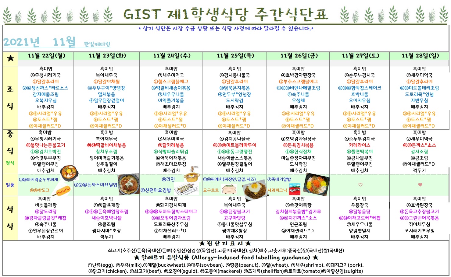 제1학생식당 11월 4째주 식단표(11/22~11/28)