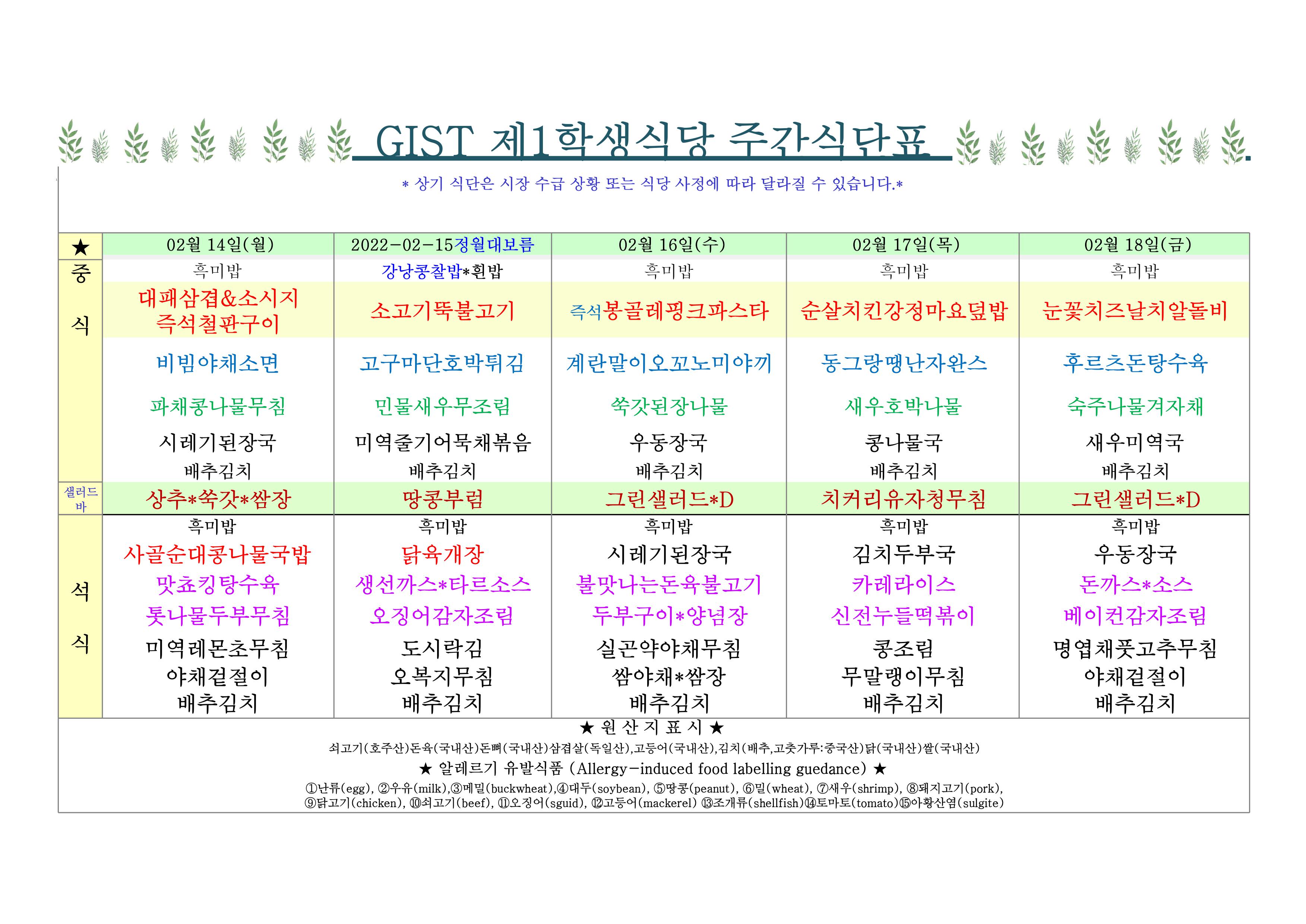 2022년 2월3째주식단표(2월14일~2월19일)