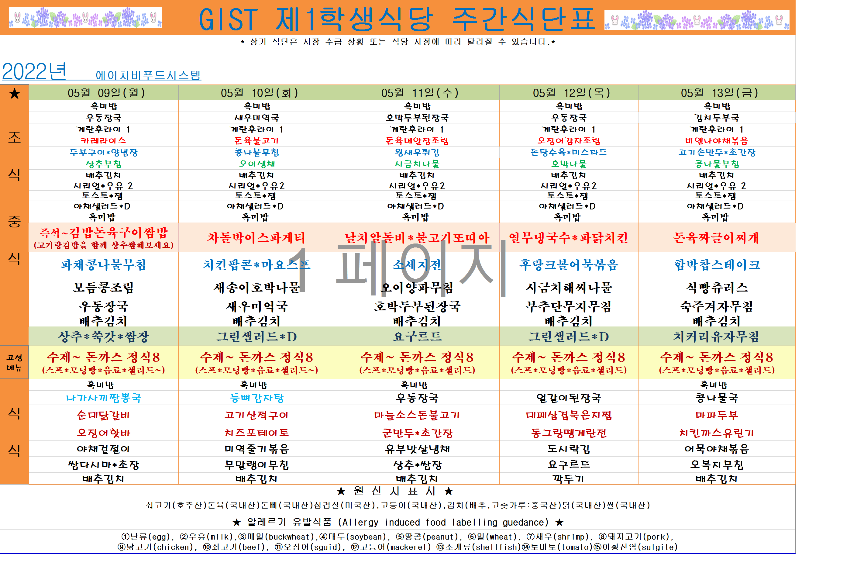 2022년 5월2째주식단표(5월9일~5월13일)