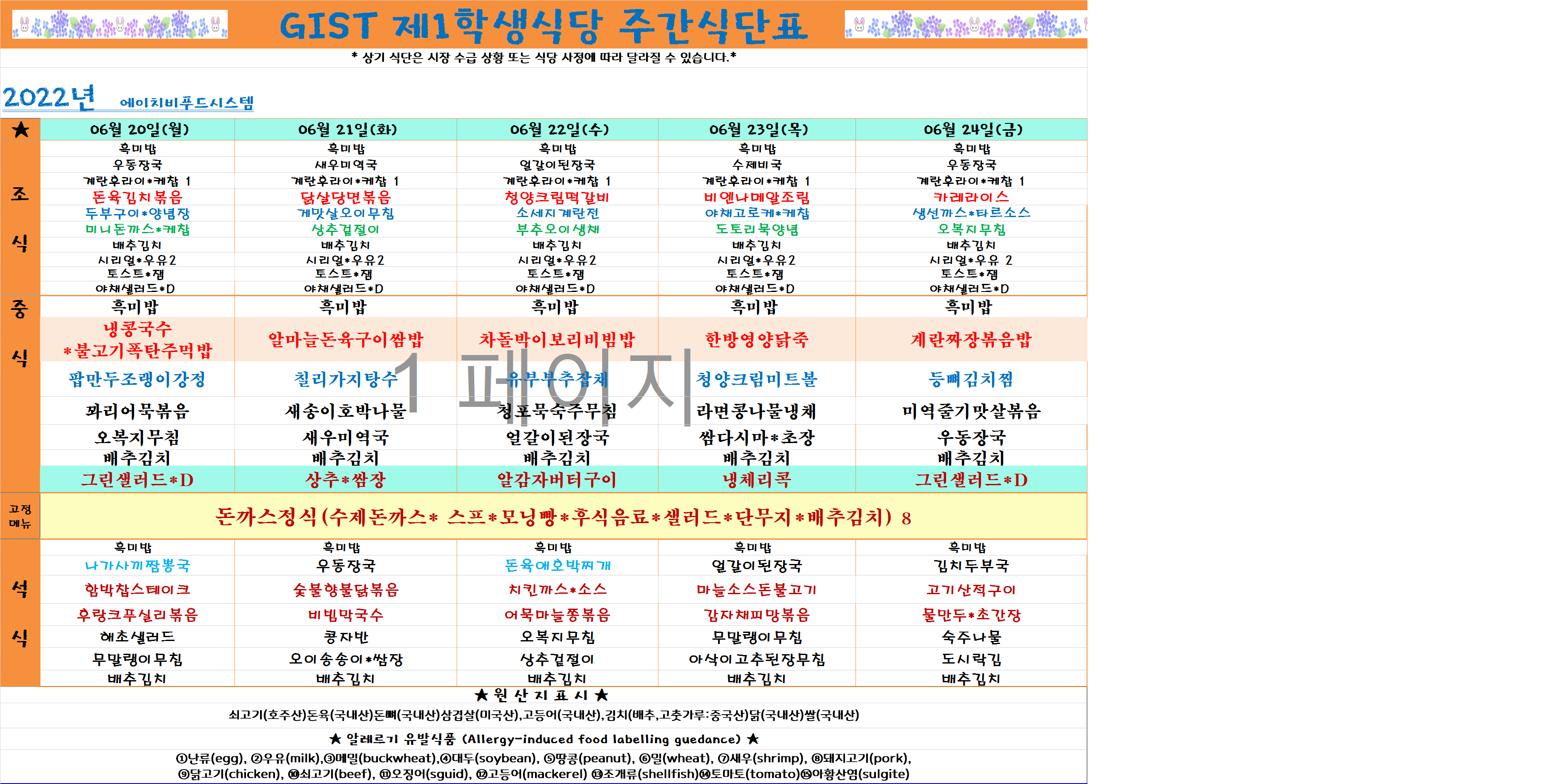 2022년 6월4째주식단표(6월20일~6월24일)