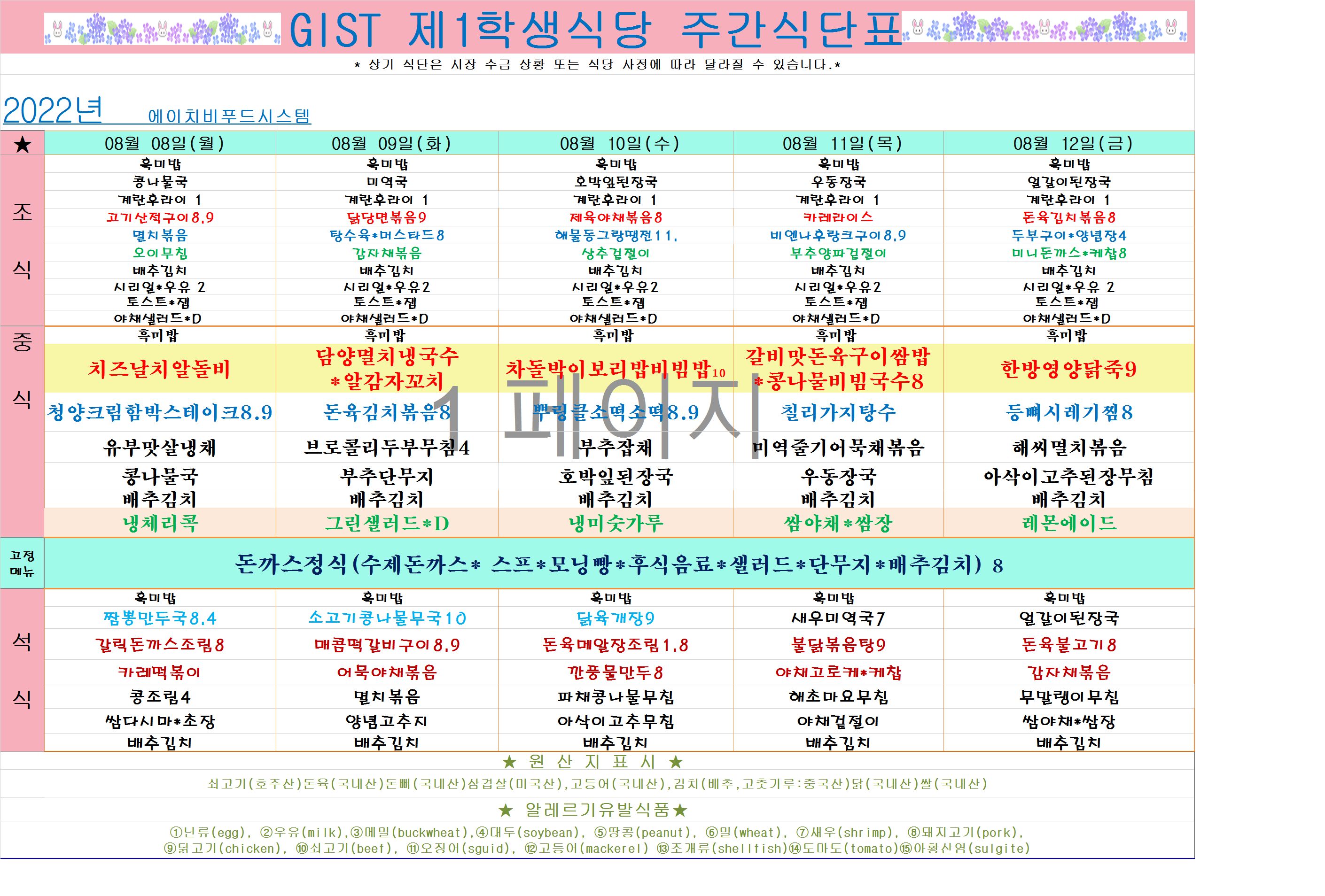 2022년 8월12주식단표(8월8월~8월12일)