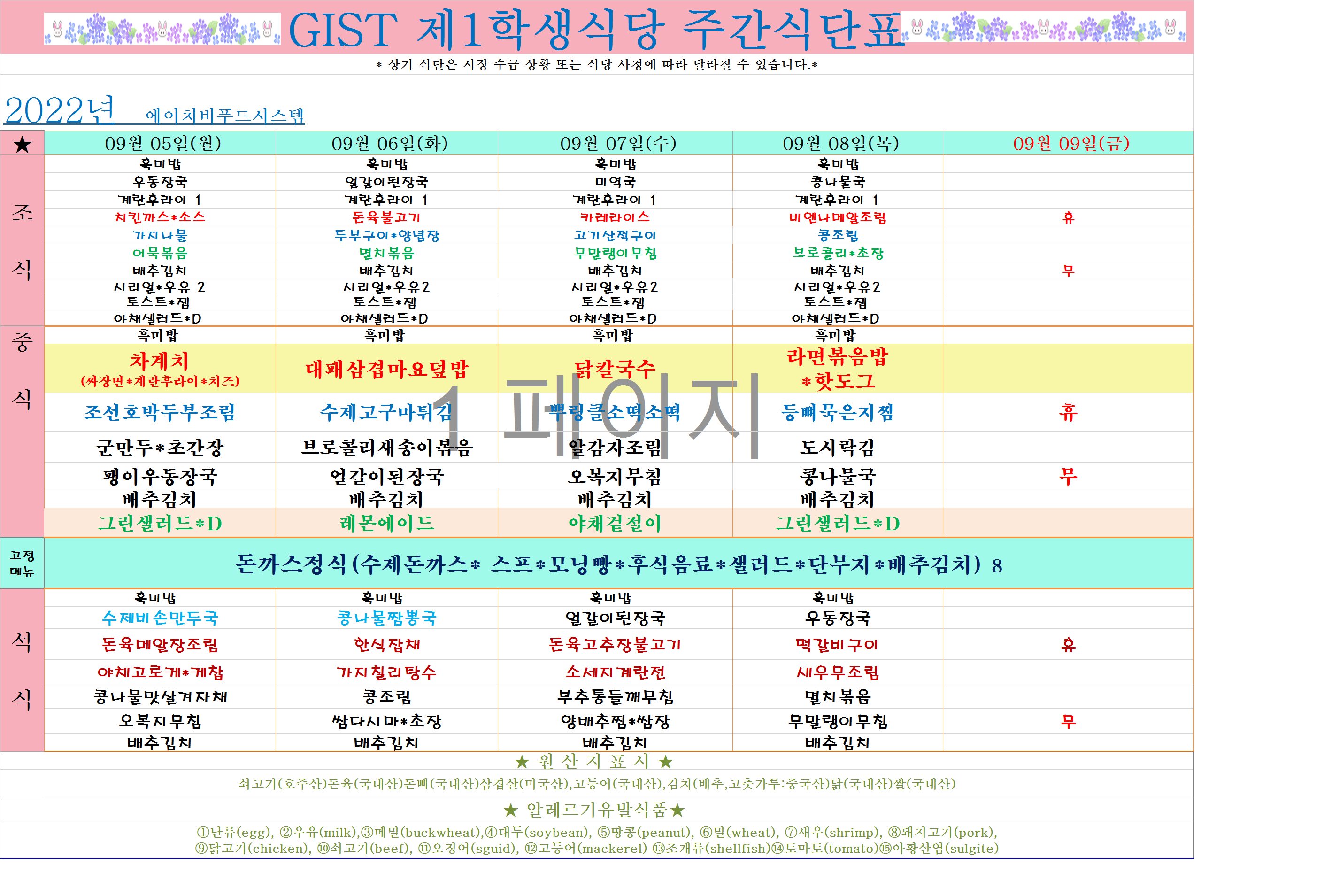 2022년 9월1째주식단표(9월5월~9월9일)