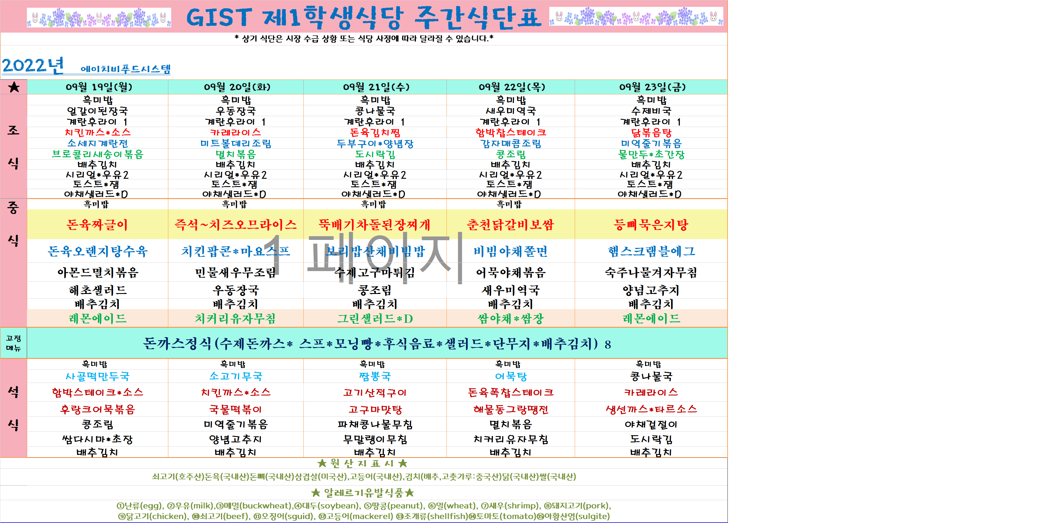 2022년 9월3째주식단표(9월19월~9월23일)