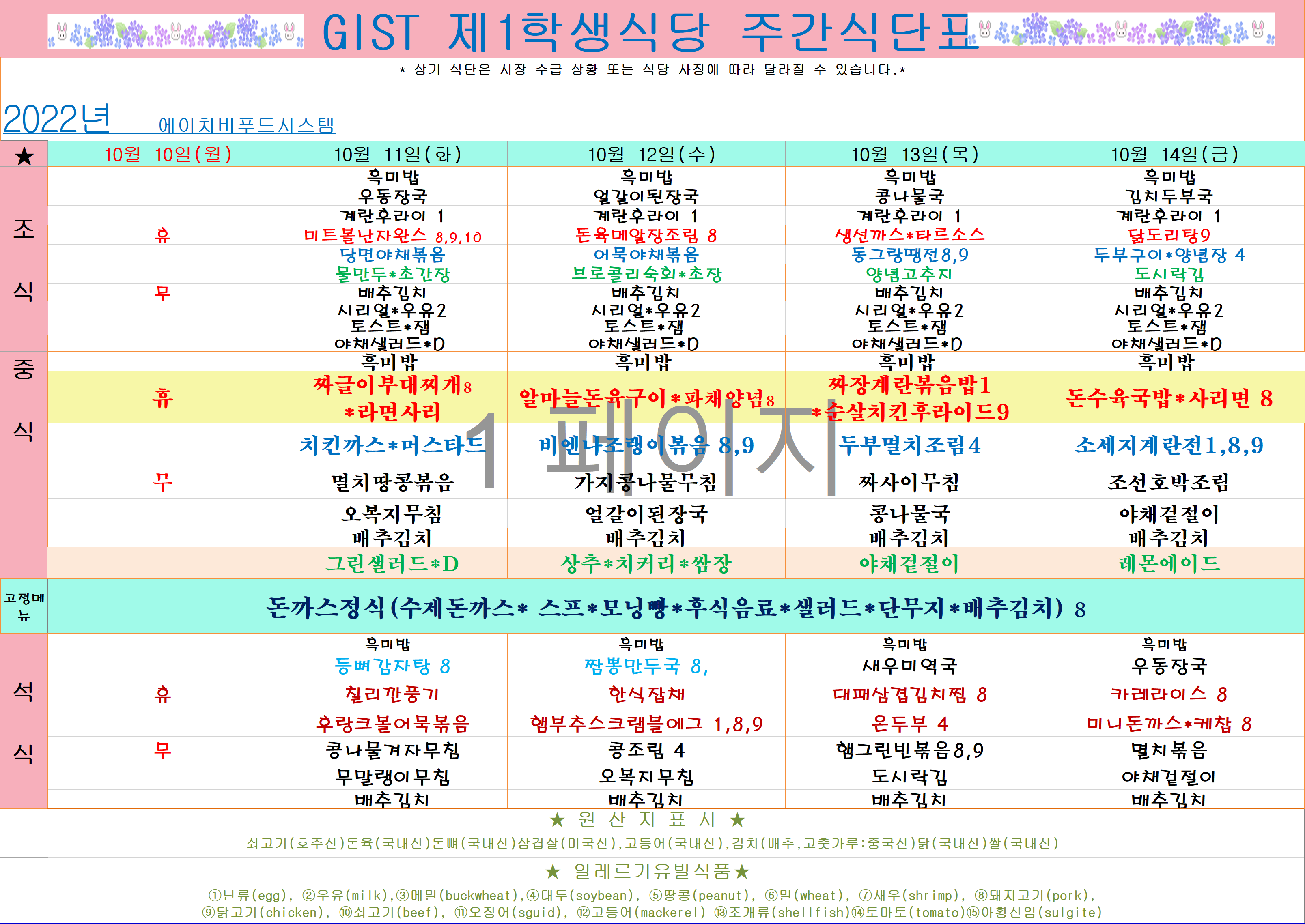 2022년 10월2째주식단표(10월10일~10월14일)