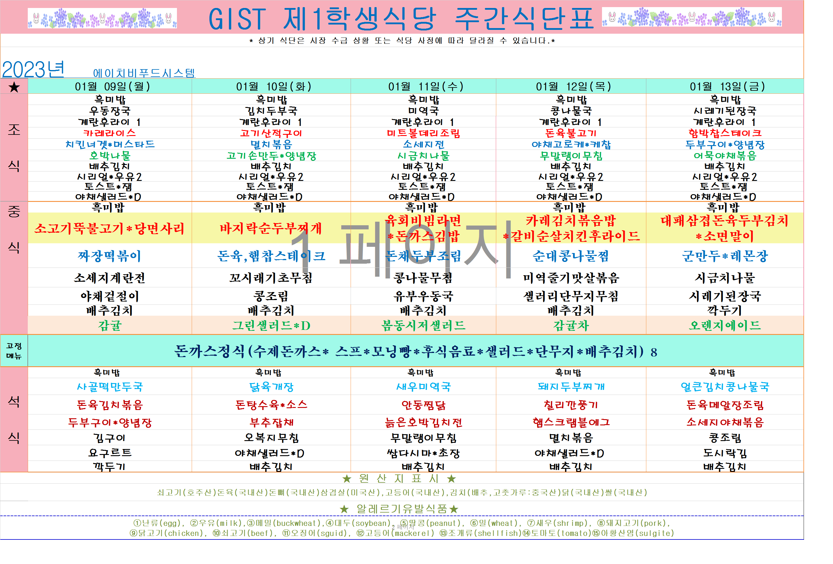 2023년 1월2째주식단표(1월9일~1월13일)