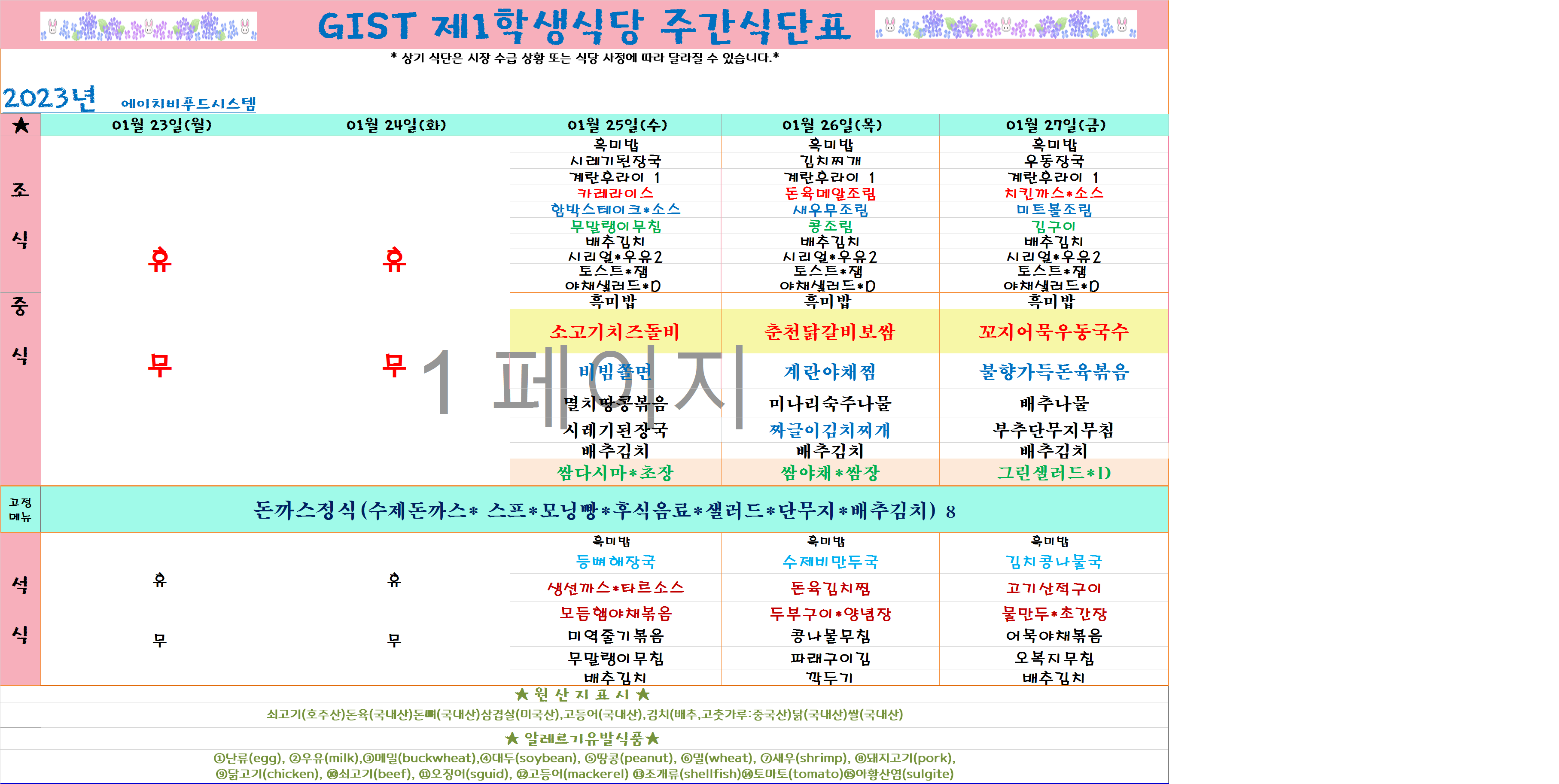 2023년 1월4째주식단표(1월23일~1월27일)