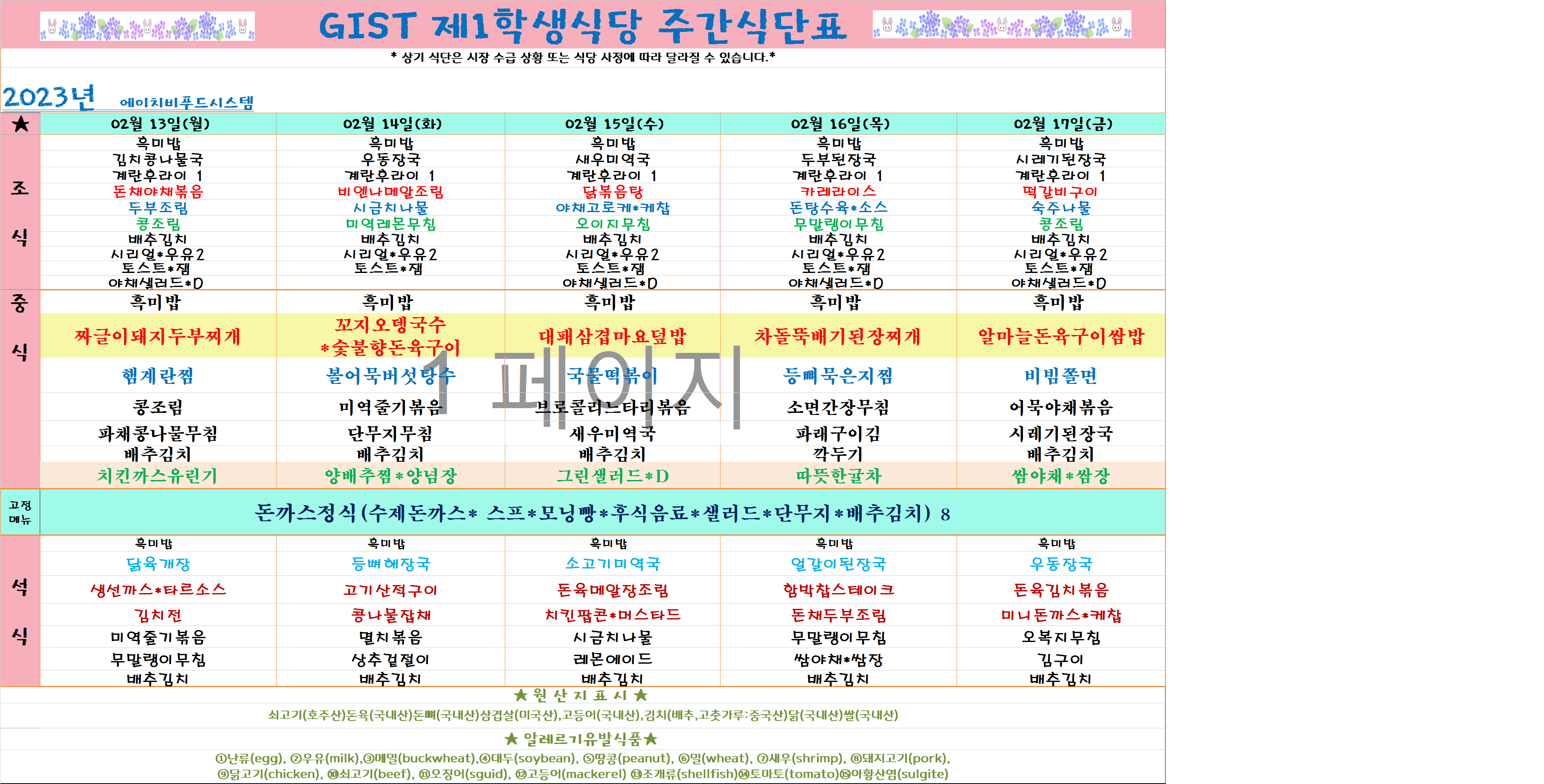 2023년 2월3째주식단표(2월13일~2월17일)