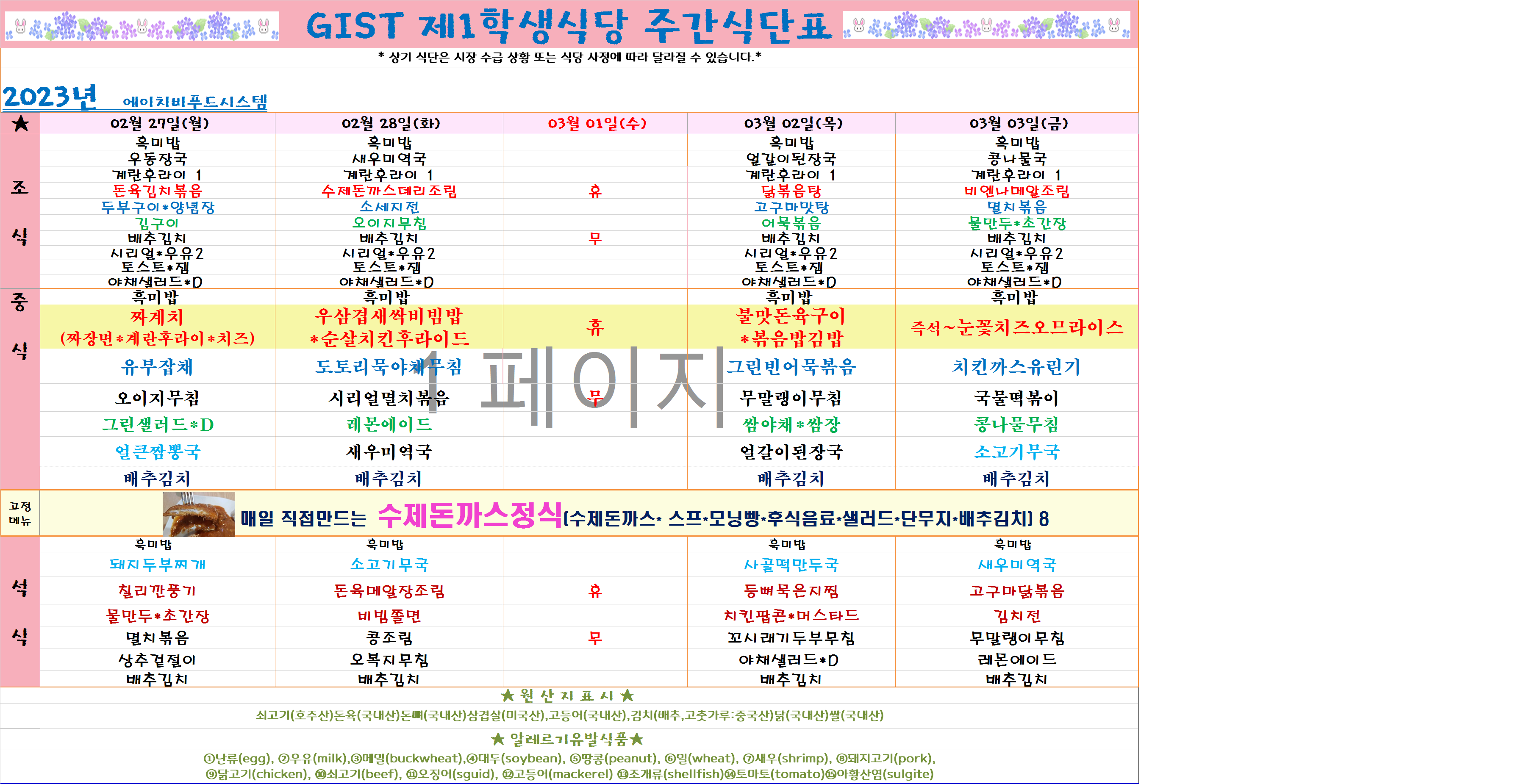 2023년 3월1째주식단표(2월27일~3월3일)