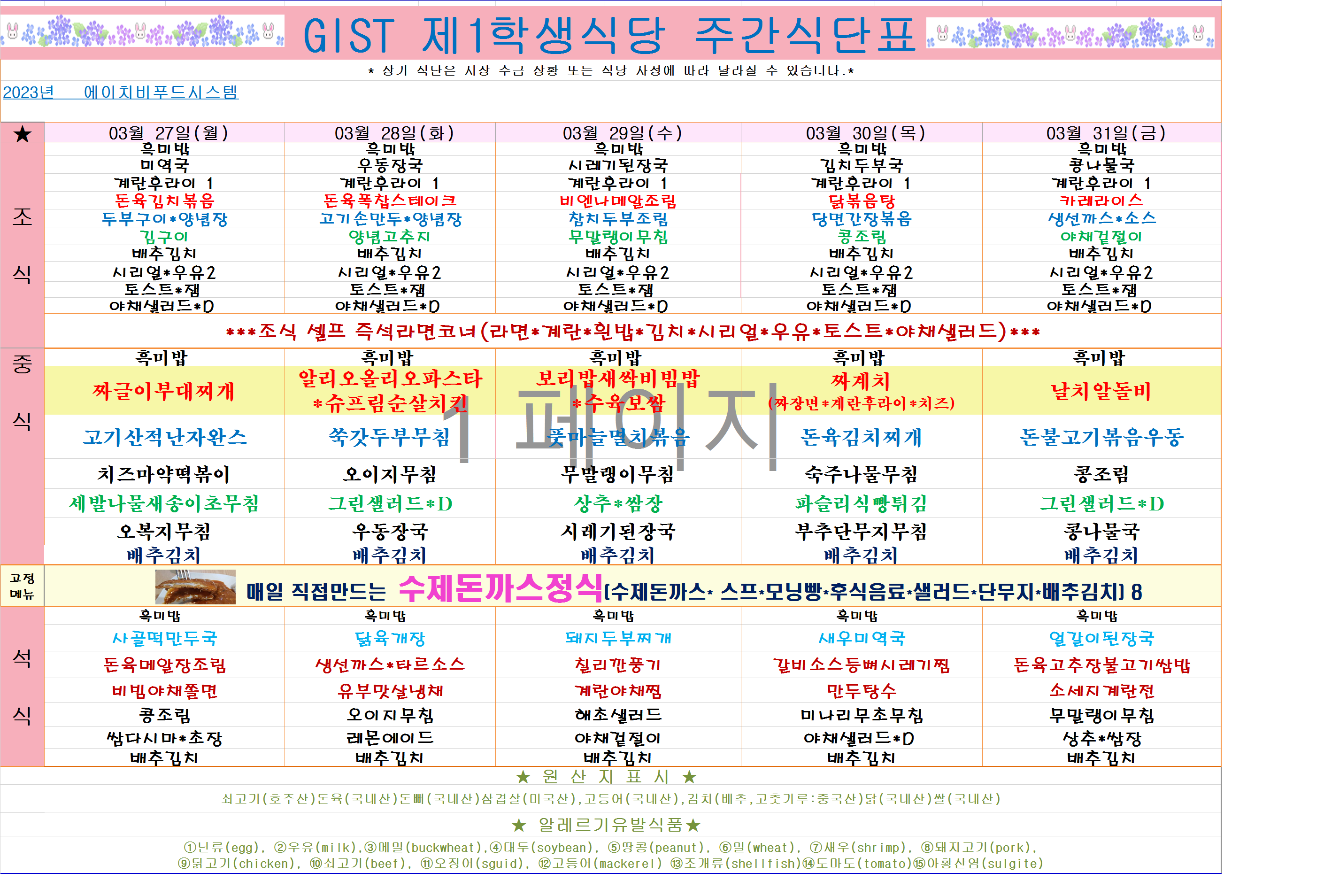 2023년 3월5째주 식단표(3월27일~3월31일)