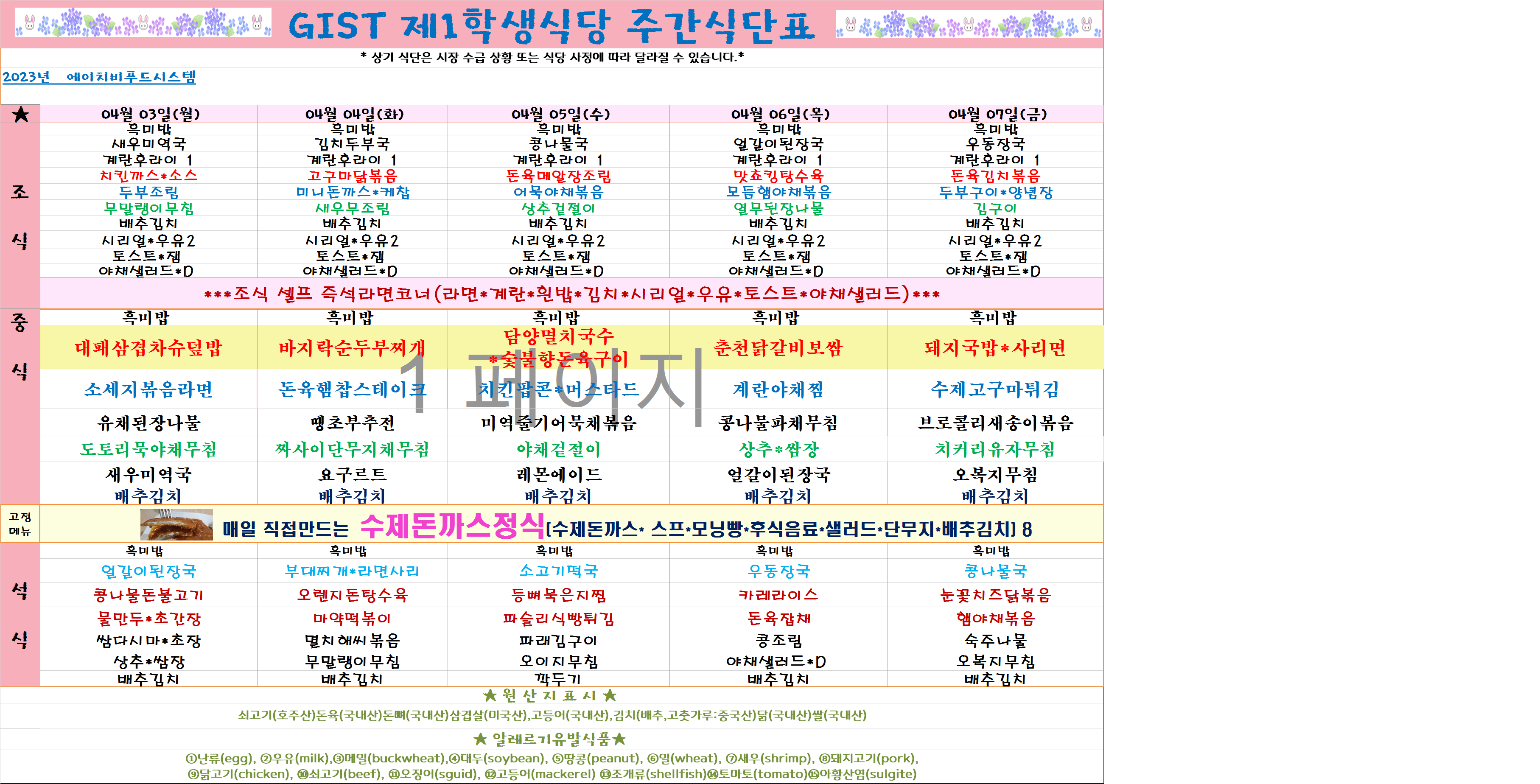 2023년 4월1째주 식단표(4월3일~4월7일)