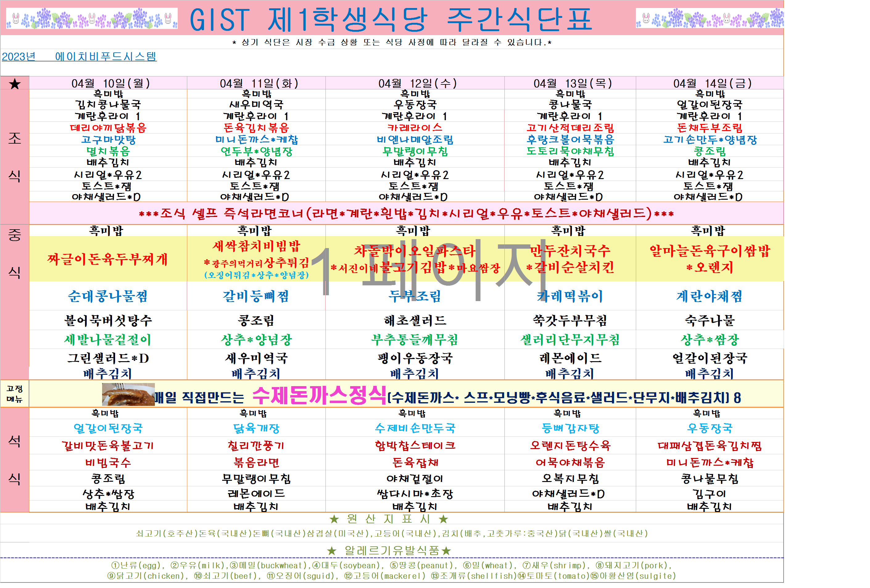 2023년 4월2째주 식단표(4월10일~4월14일)