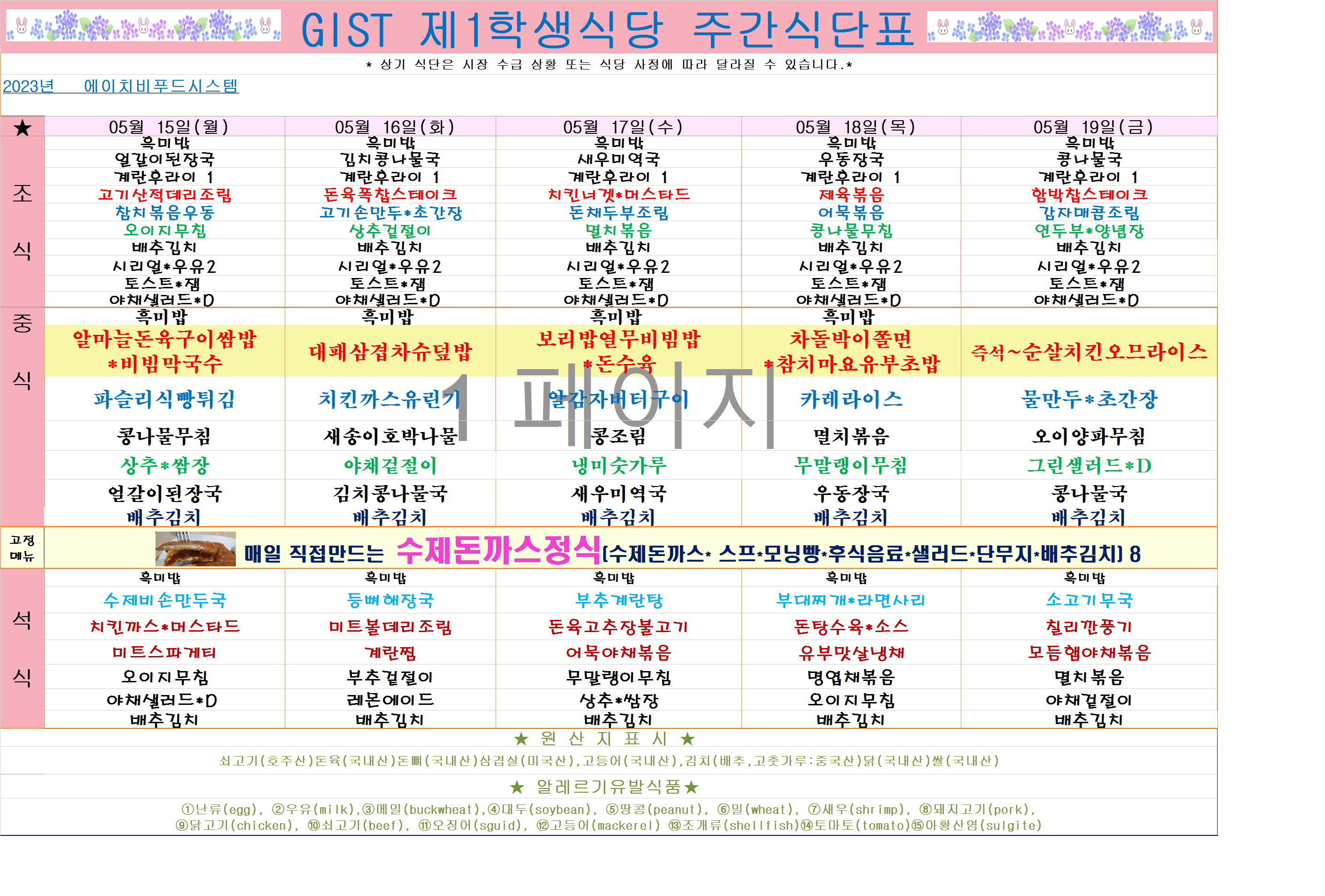 2023년 5월15일~5월19일 식단표