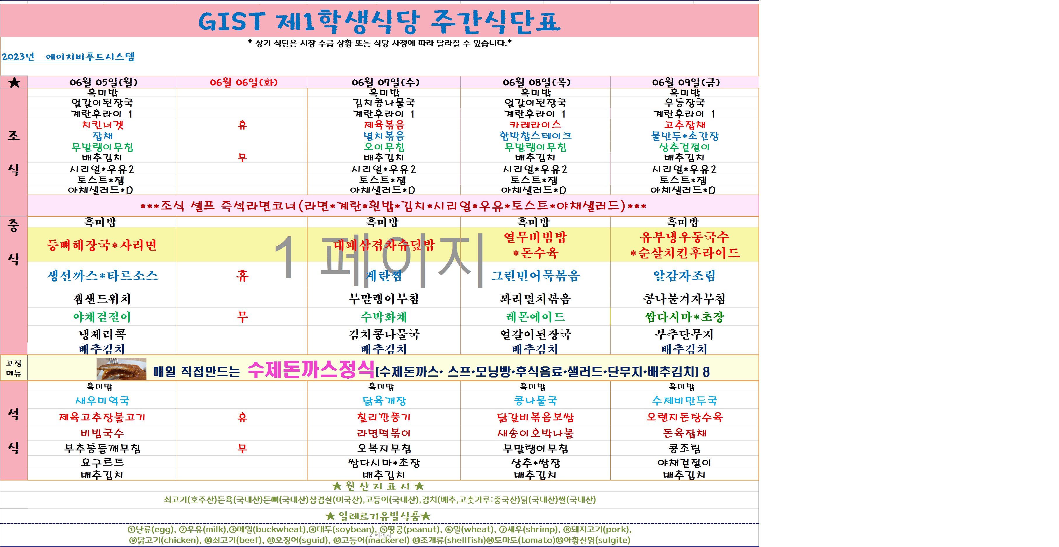 2023년 6월5일~6월9일 식단표