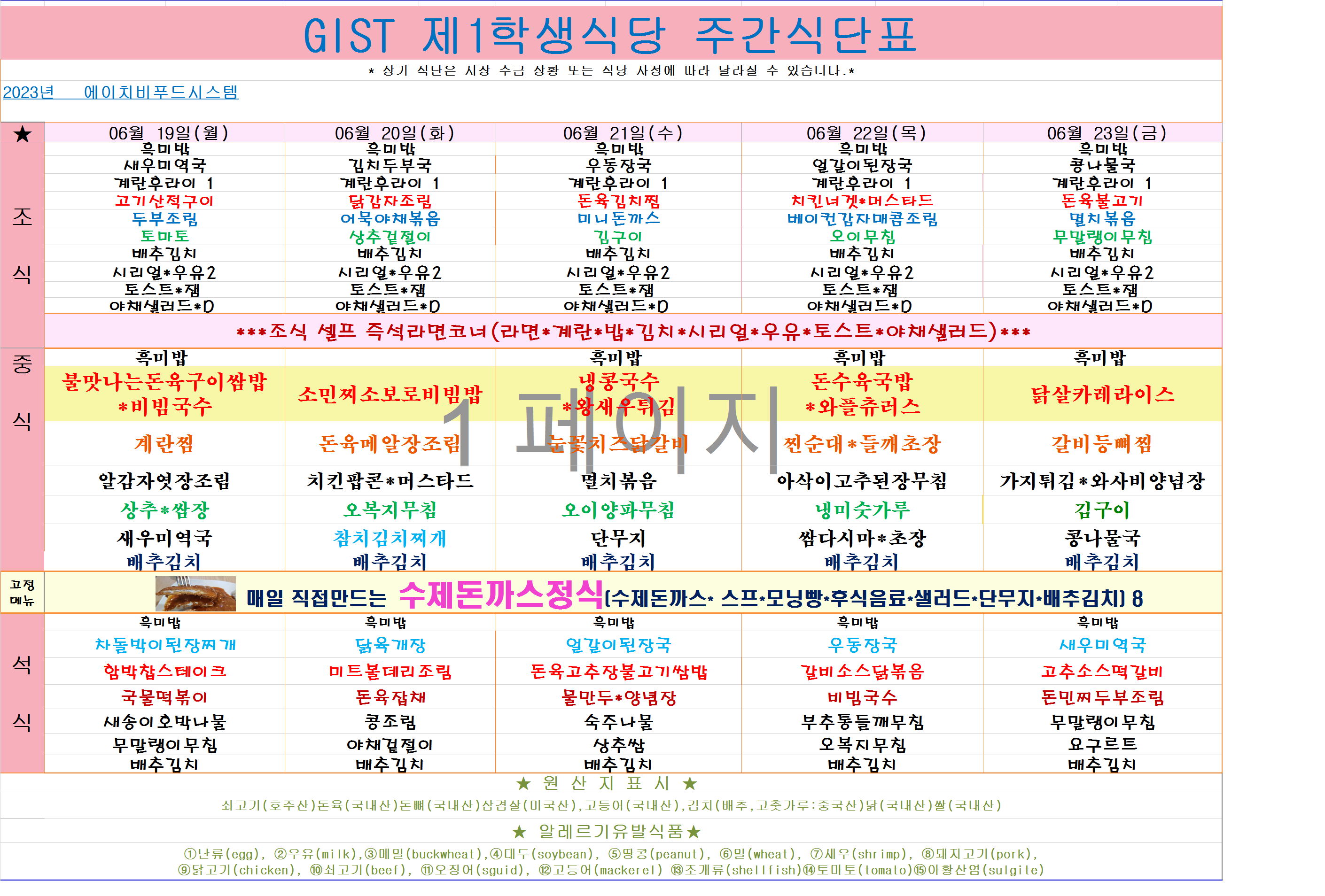 2023년 6월19일~6월23일 식단표