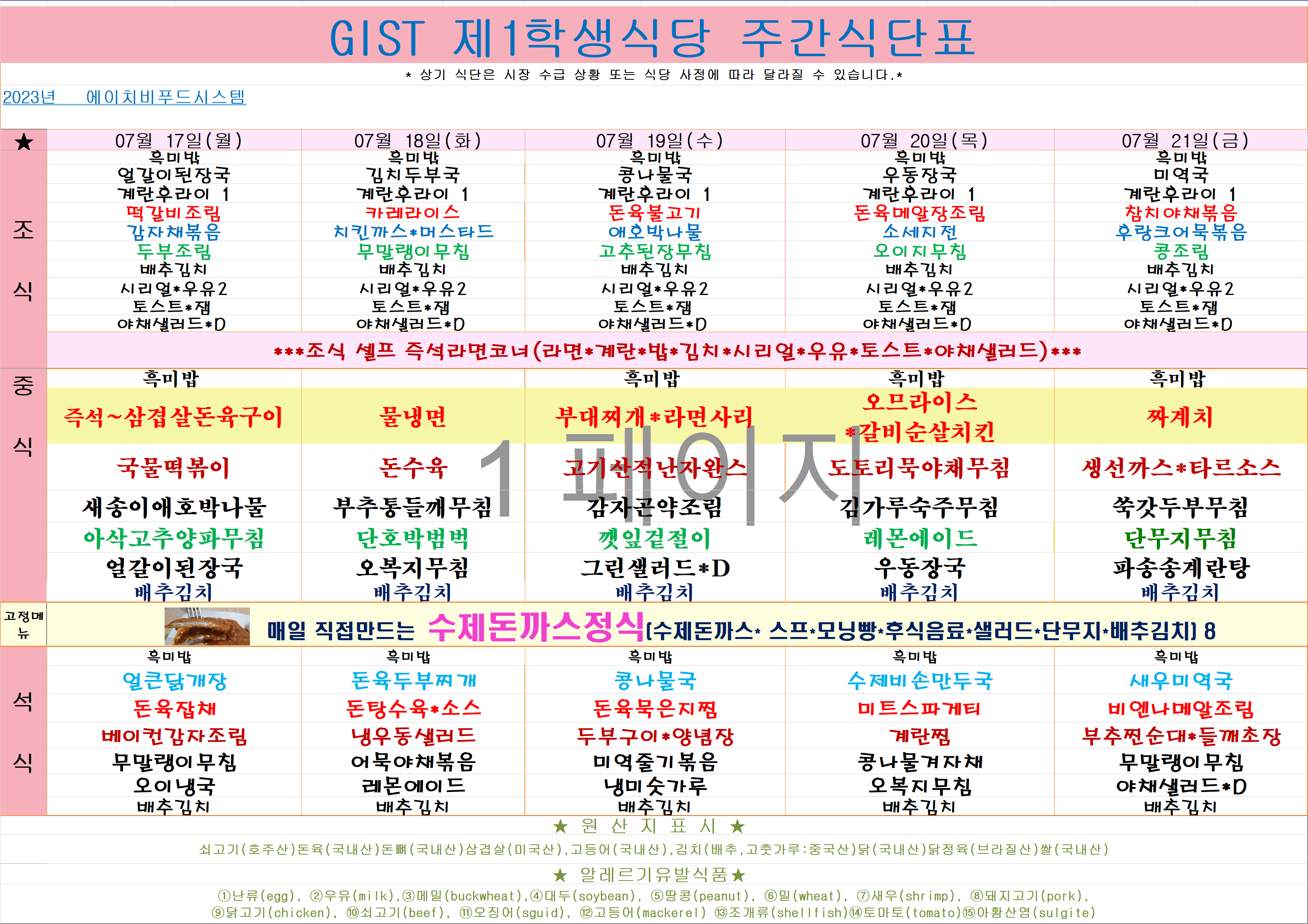 2023년 7월17일~7월21일 식단표