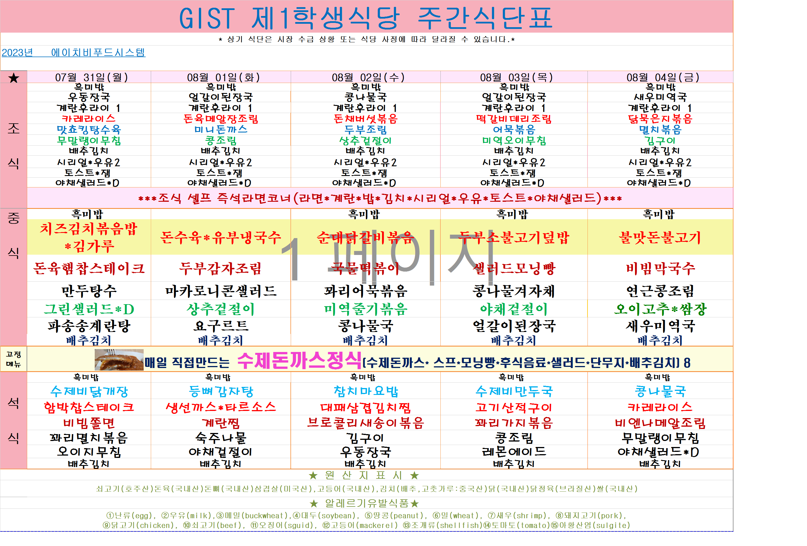 2023년 7월31일~8월4일 식단표