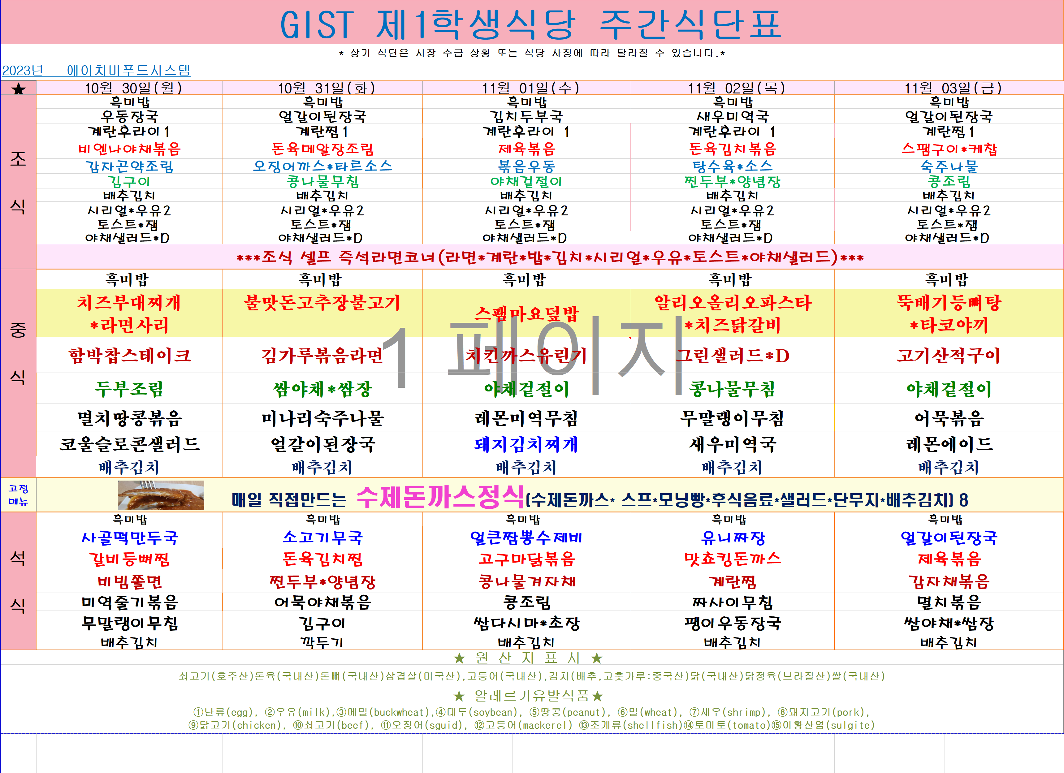 2023년 10월30일~11월3일 식단표