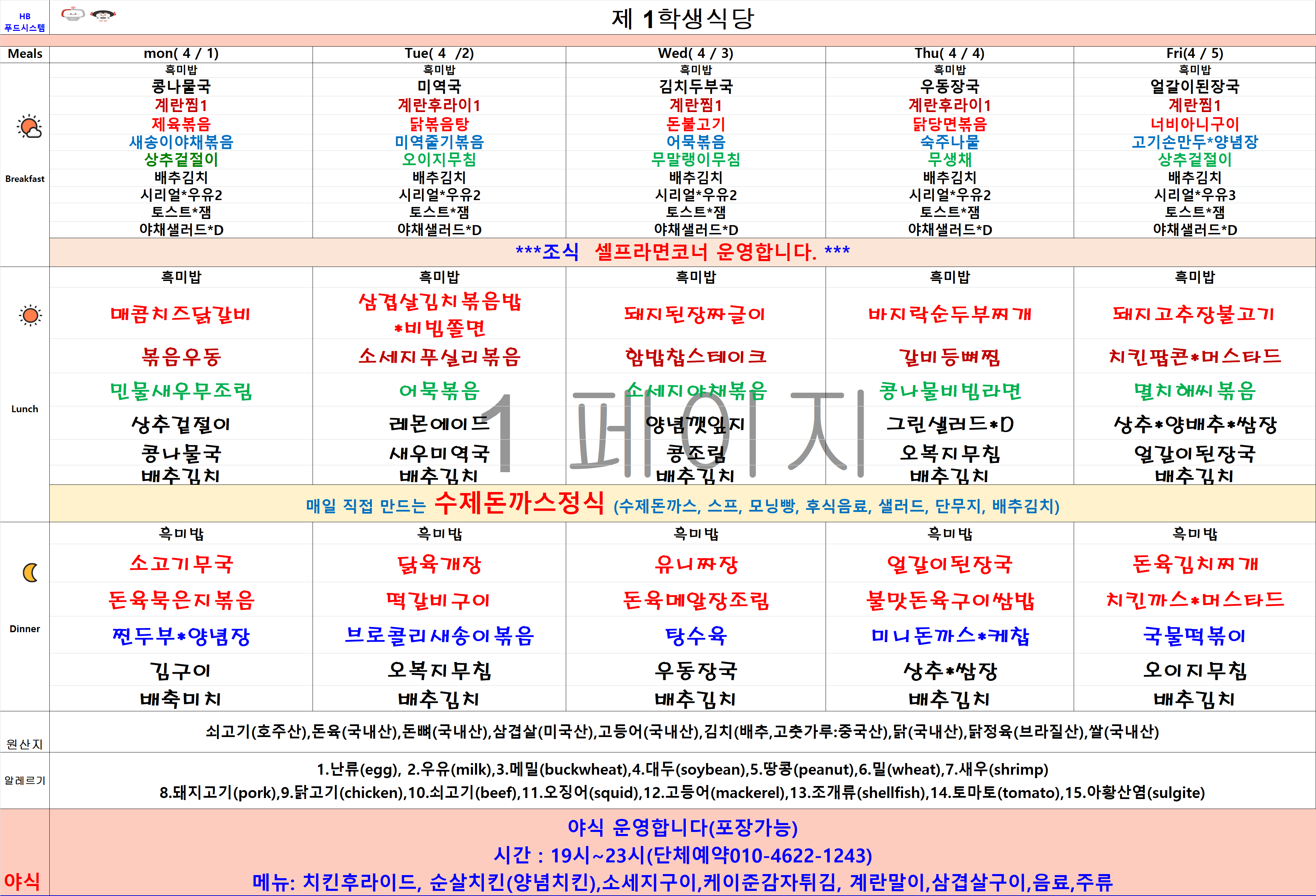2024년 4월1일~4월5일 식단표