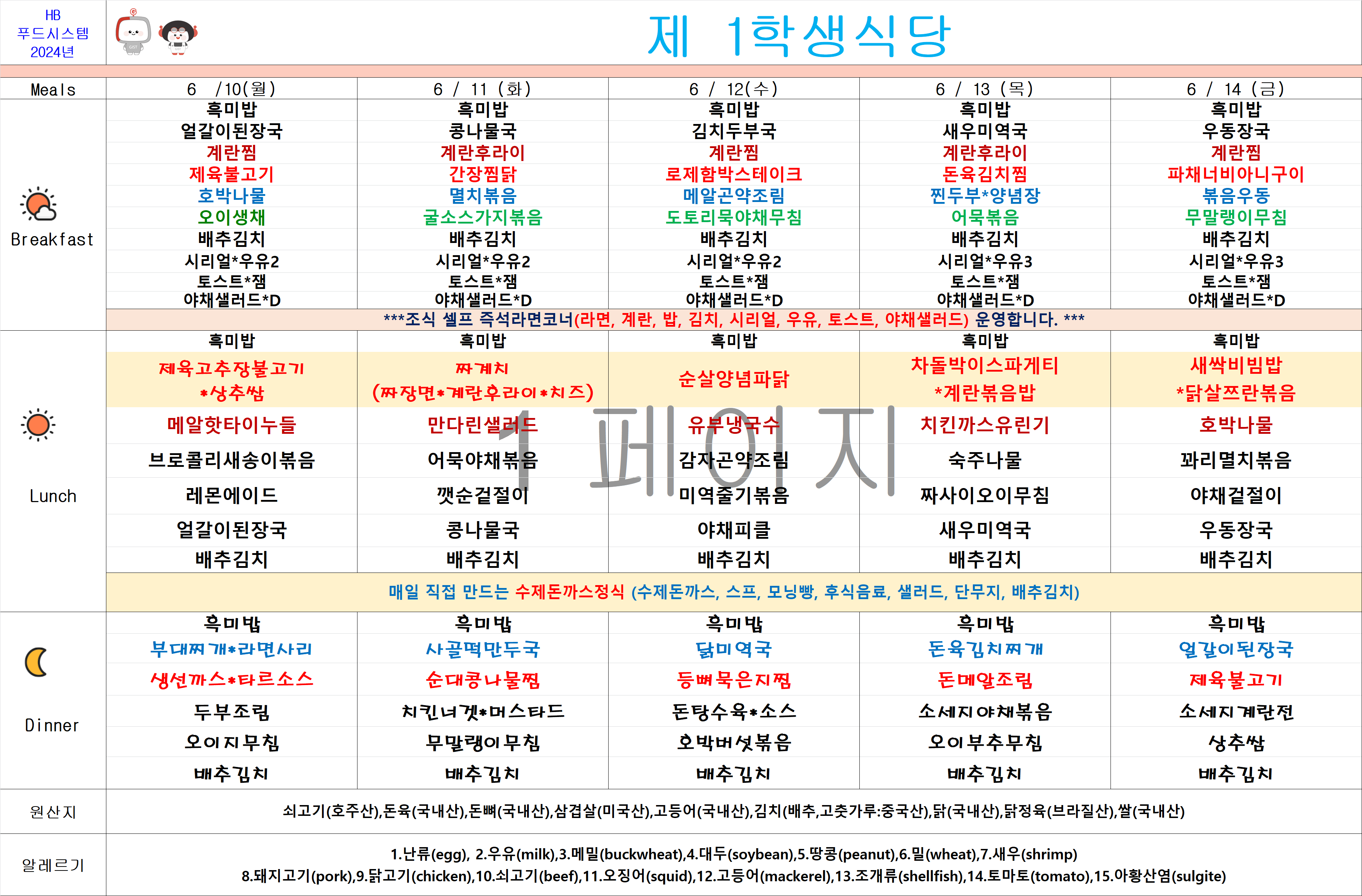 2024년 6월10일~6월14일 식단표